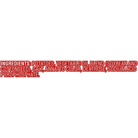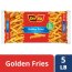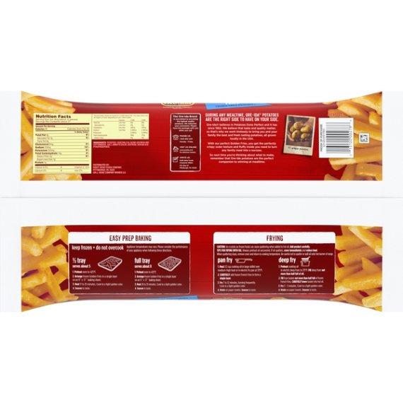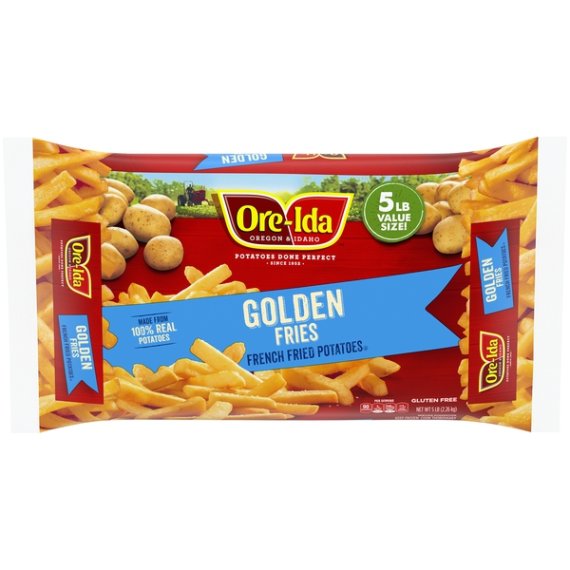 Details Ingredients Potatoes, Vegetable Oil Blend (Soybean And Cottonseed), Salt, Annatto Color, Dextrose, Sodium Acid Pyrophosphate. Product features Ore-Ida Golden French Fries makes it easy to enjoy delicious fries at home. Crispy and golden, these Grade A fries are made from freshly peeled, American grown potatoes. These gluten free fries offer a crispy outside with a fluffy inside for the perfect blend of textures to make your next family meal a success. Toss these frozen French fries on a baking sheet to bake them in the oven according to package instructions for perfect golden fries. An American classic, these easy fries are perfect for dipping. Serve up the traditional burger and fries, or get creative with loaded fries topped with cheese and bacon. These oven baked fries come sealed in a 5 pound bag help lock in flavor. Your family deserves the highest quality because if it's not Grade A, it's not Ore-Ida! One 5 lb. bag of Ore-Ida Golden French Fries Ore-Ida Golden French Fries offer an easy side dish for your meals Gluten free French fries Made from the highest quality Grade A potatoes grown in the U.S. Classic fries are perfect for dipping in ketchup Enjoy the classic burger and fries combo Sealed in a bag for convenient storage in your freezer Special Features Gluten-free Net Quantity of Content 27.0 X 3 oz (84g/about 14 pieces)