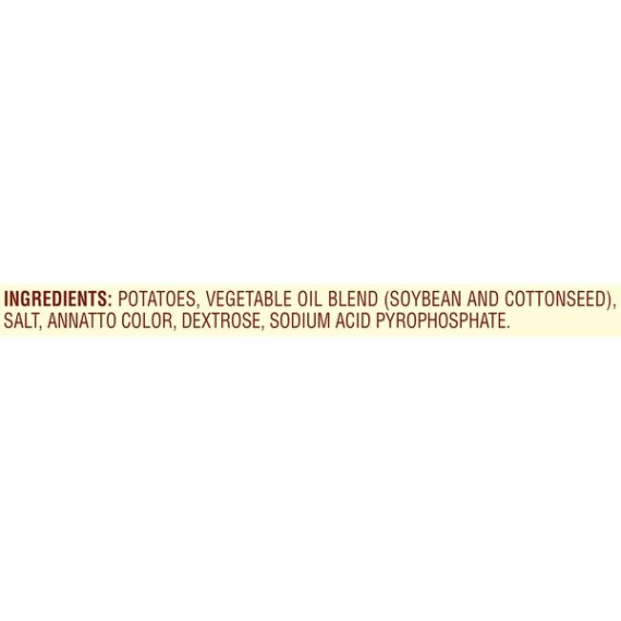 Details Ingredients Potatoes, Vegetable Oil Blend (Soybean And Cottonseed), Salt, Annatto Color, Dextrose, Sodium Acid Pyrophosphate Product features Ore-Ida Golden Steak Fries make it easy to enjoy delicious fries at home. Crispy and golden, these Grade A fries are made from freshly peeled, American grown potatoes cut into thick fries. These gluten free fries offer a crispy outside with a fluffy inside for the perfect blend of textures to make your next family meal a success. Toss these frozen fries on a baking sheet to bake them in the oven according to package instructions for perfect golden fries. An American classic, these easy fries are perfect for dipping. Serve up the traditional burger and fries, or get creative with loaded steak fries topped with cheese and bacon. These oven baked fries come sealed in a 28 ounce bag to help lock in flavor. Your family deserves the highest quality because if it's not Grade A, it's not Ore-Ida! One 28 oz. bag of Ore-Ida Golden Steak Fries Ore-Ida Golden Steak Fries offer an easy side dish for your meals Gluten free French fries Made from the highest quality Grade A potatoes grown in the U.S. Classic fries are perfect for dipping in ketchup Enjoy the classic burger and fries combo Sealed in a bag for convenient storage in your freezer Special Features Steak fries Net Quantity of Content 9.0 X 3 OZ (84g/about 7 pieces)