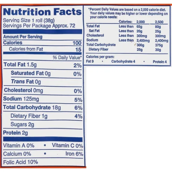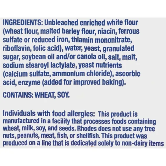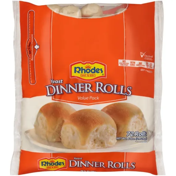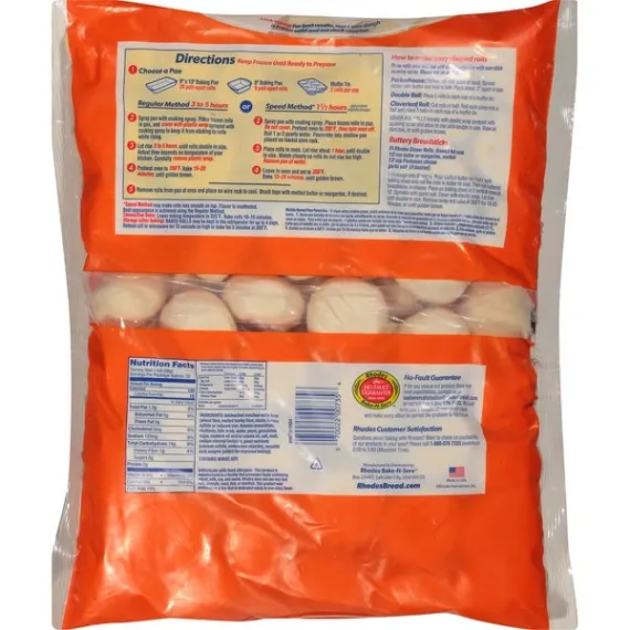 Details Ingredients UNBLEACHED ENRICHED WHITE FLOUR (WHEAT FLOUR, MALTED BARLEY FLOUR, NIACIN, FERROUS SULFATE OR REDUCED IRON, THIAMIN MONONITRATE, RIBOFLAVIN, FOLIC ACID), WATER, YEAST, GRANULATED SUGAR, SOYBEAN AND/OR CANOLA OIL, SALT, MALT, SODIUM STEAROYL LACTYLATE, YEAST NUTRIENTS (CALCIUM SULFATE, AMMONIUM CHLORIDE), ASCORBIC ACID, ENZYME (ADDED FOR IMPROVED BAKING). Show more Product features Soft and delicious, this Rhodes Bake N Serve Dinner Rolls Dough will make an ideal addition to your meals. With a smooth, home-baked flavor these rolls are sure to please everyone. In addition to having a delectable texture, these Rhodes yeast rolls can easily be used for making butter flake rolls and Rhodes' famous and tasty butterscotch bubble loaf. They don't contain any preservatives, offering you a natural blend of ingredients that will cook up easily. This frozen dinner roll dough has a convenient resealable closure on the bag so you can store what you don't use until the next time. Rhodes Bake-N-Serv Frozen White Dinner Rolls Dough 72 Count Bag: No preservatives No trans fat Rhodes yeast rolls are kosher pareve Home-baked flavor Resealable closure on the bag Non GMO Does not have any high-fructose corn syrup Contains 100 calories per serving Serving size is 1 roll Special Features No trans fat Net Quantity of Content 72 X 38 g