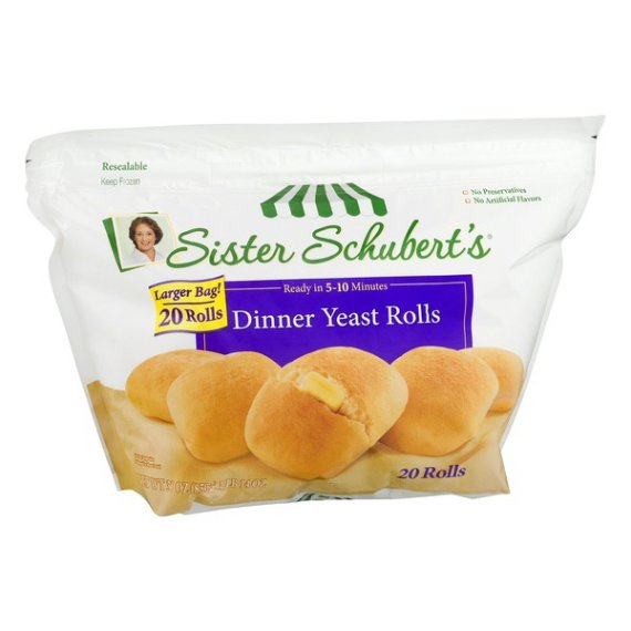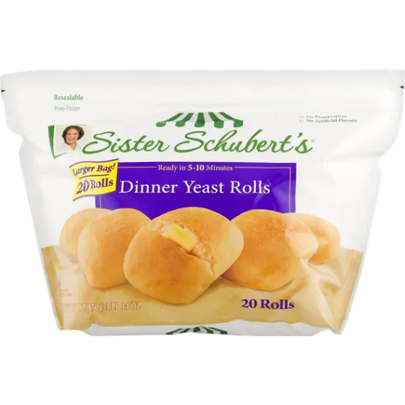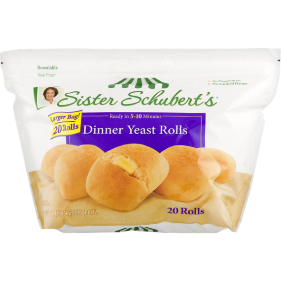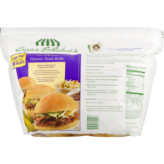 Details Ingredients ENRICHED WHEAT FLOUR (WHEAT FLOUR, NIACIN, REDUCED IRON, THIAMINE MONONITRATE, RIBOFLAVIN, FOLIC ACID), WATER, SUGAR, SOYBEAN OIL, EGGS, SALT, HYDROGENATED COTTONSEED OIL, YEAST, MONO AND DI-GLYCERIDES, WHEY. Show more Product features Rolls, Yeast, Dinner, Bag 20 CT Ready in 5-10 minutes. No preservatives. No artificial flavors. Larger bag! Resealable. For sliders and other great recipes using Sister Schubert's rolls, visit us at: www.SisterSchuberts.com. Never compromise the ingredients! - Sister Schubert, Founder. Sister Schubert began making rolls in her own kitchen for a holiday bake sale. The rolls were so popular, Sister began selling them to grocery stores so everyone could enjoy them and Sister Schubert's Homemade Rolls were born. Sister, a nickname given to her by her older sister as a child, bakes her delicious rolls using the finest ingredients and no preservatives and then freezes them fresh. All you have to do is heat, serve and savor the homemade taste - pure & simple. Produced with genetic engineering. Questions? 1-888-220-4497. www.sisterschuberts.com. Keep frozen. Preparation Directions: Conventional Oven: Preheat oven to 350 degrees F. Remove desired number of frozen rolls from bag. Brush tops of rolls with butter or topping of your choice. Place frozen rolls on baking sheet on middle rack of oven. Heat in pre-heated oven for 5-10 minutes or until desired browning has occurred on top and bottom. Toaster Oven: Preheat oven to 350 degrees F. Place desired number of frozen rolls on ungreased toaster oven tray. Bake 10-12 minutes or until desired browning has occurred on top and bottom. Contains: egg, milk, wheat. 20 rolls [30 oz (1 lb 14 oz) 850 g] Columbus, OH 43229 888-220-4497 T. Marzetti Co. Dinner Rolls, Yeast Ready in 5-10 minutes. No preservatives. No artificial flavors. Larger bag! Resealable. For sliders and other great recipes using Sister Schubert's rolls, visit us at: www.SisterSchuberts.com. Never compromise the ingredients! - Sister Schubert, Founder. Sister Schubert began making rolls in her own kitchen for a holiday bake sale. The rolls were so popular, Sister began selling them to grocery stores so everyone could enjoy them and Sister Schubert's Homemade Rolls were born. Sister, a nickname given to her by her older sister as a child, bakes her delicious rolls using the finest ingredients and no preservatives and then freezes them fresh. All you have to do is heat, serve and savor the homemade taste - pure & simple. Produced with genetic engineering. Questions? 1-888-220-4497. www.sisterschuberts.com. Net Quantity of Content ABOUT 20 X 43 g