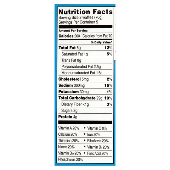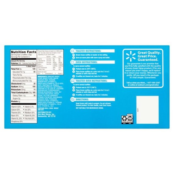 Details Ingredients ENRICHED WHEAT FLOUR (FLOUR, NIACIN, REDUCED IRON, THIAMINE MONONITRATE [VITAMIN B1], RIBOFLAVIN [VITAMIN B2], FOLIC ACID), WATER, WHEY, VEGETABLE OIL (CANOLA AND/OR SOYBEAN OIL), BUTTERMILK, EGGS, SOY LECITHIN, LEAVENING [SODIUM ACID PYROPHOSPHATE, SODIUM BICARBONATE), SUGAR, CALCIUM CARBONATE, PYRIDOXINE HYDROCHLORIDE (VITAMIN B6), RIBOFLAVIN (VITAMIN B2), THIAMINE MONONITRATE (VITAMIN B1), FOLIC ACID, VITAMIN B12). Show more Product features Buttermilk Waffles Product Features Rich in calcium Kosher - D Bag - Plastic - Store Drop-Off Box - Paper - Widely Recycled Recycle if clean & dry how2recycle.info walmart.com/greatvalue Net Quantity of Content 5 X 70 g
