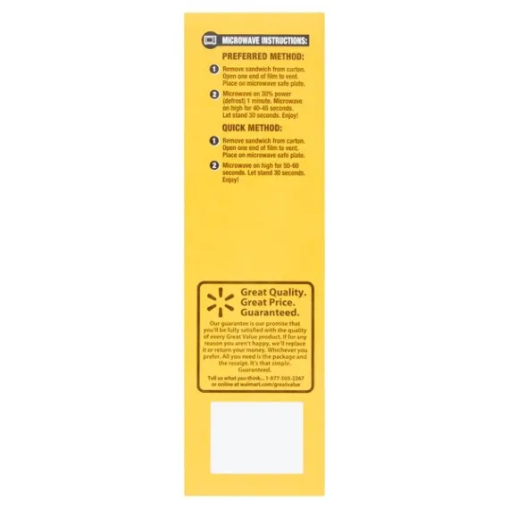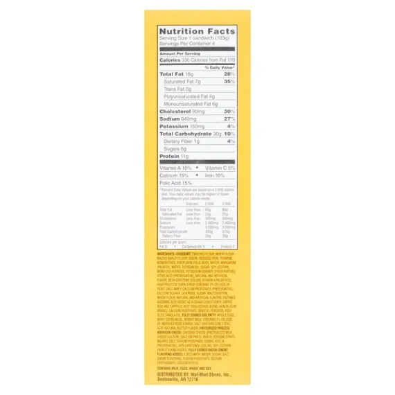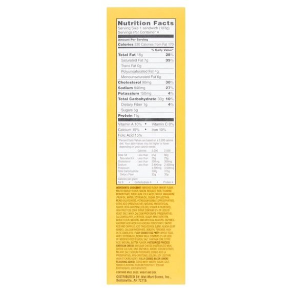 Details Ingredients CROISSANT: ENRICHED WHEAT FLOUR (UNBLEACHED WHEAT FLOUR, MALTED BARLEY FLOUR, NIACIN, IRON [REDUCED], THIAMINE MONONITRATE, RIBOFLAVIN, FOLIC ACID), WATER, MARGARINE (PALM OIL, WATER, SOYBEAN OIL, SALT, WHEY [MILK], MONO-AND DIGLYCERIDES, SOYBEAN LECITHIN [SOY], NATURAL BUTTER FLAVOR, COLORED WITH BETA CAROTENE, VITAMIN A PALMITATE ADDED), SUGAR, CONTAINS 2% OR LESS OF: SALT, LEAVENING (YEAST), DOUGH CONDITIONER (RYE FLOUR, MALTED BARLEY FLOUR, ASCORBIC ACID, ENZYMES), NON-FAT DRY MILK, SOY FLOUR, EGGS, PRESERVATIVE (CALCIUM PROPIONATE). FULLY COOKED EGG PATTY: WHOLE EGGS, WATER, VEGETABLE OIL (CORN AND/OR SOYBEAN OIL), WHEY SOLIDS, NONFAT DRIED MILK, SALT, XANTHAN GUM, CITRIC ACID, WHITE PEPPER, ARTIFICIAL BUTTER FLAVOR (PARTIALLY HYDROGENATED SOYBEAN AND COTTON SEED OILS, ARTIFICIAL FLAVOR, MEDIUM CHAIN TRIGLYCERIDES). PASTEURIZED PROCESS AMERICAN CHEESE: CULTURED MILK, WATER, CREAM, SODIUM CITRATE, SALT, SODIUM PHOSPHATE, SORBIC ACID (PRESERVATIVE), LACTIC ACID, ARTIFICIAL COLOR, ENZYMES, SOY LECITHIN. FULLY COOKED BACON (SMOKE FLAVOR ADDED): CURED WITH: WATER, SUGAR, SALT, SMOKE FLAVORING, SODIUM PHOSPHATES, SODIUM ERYTHORBATE, SODIUM NITRITE. Show more Product features Great Value Bacon Egg & Cheese on a Croissant Sandwiches are a convenient and tasty way to start your morning. This fully cooked breakfast sandwich is topped with delicious bacon, perfectly cooked egg, and American cheese. Our hearty sandwiches are ready to eat in as little as a minute. Serve with a bowl of fruit and a glass of cold milk, and you’ll have a delicious and nutritious breakfast. Our filling croissant sandwiches have zero trans fat and 11 grams of protein per serving. Enjoy home-cooked breakfast flavor with Great Value Bacon Egg & Cheese on a Croissant Sandwiches. Great Value products provide families with affordable, high quality grocery and household consumable options. With our wide range of product categories spanning grocery and household consumables, we offer you a variety of products for your family's needs. Our products are conveniently available online and in Walmart stores nationwide, allowing you to stock up and save money at the same time Great Value Bacon Egg & Cheese on a Croissant Sandwiches, 3.66 oz, 4 Count: Ready in as little as 1 minute Delicious for breakfast Fully cooked 11 grams of protein per serving 0 grams of trans fat Net Quantity of Content 4 X 103 g
