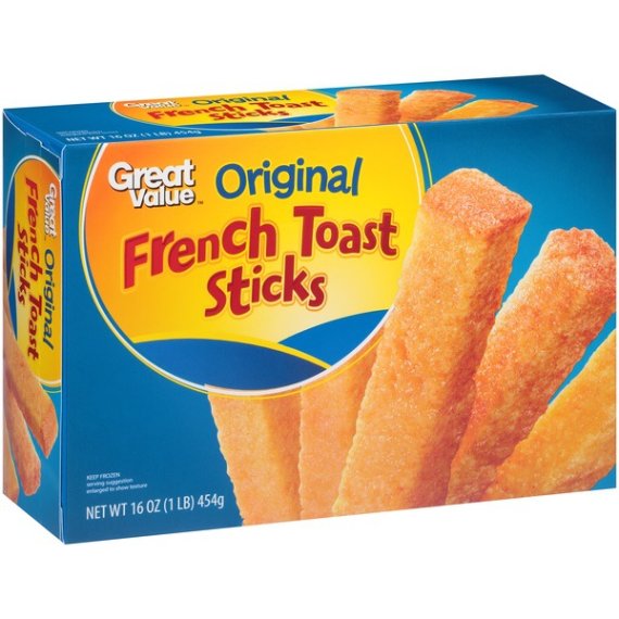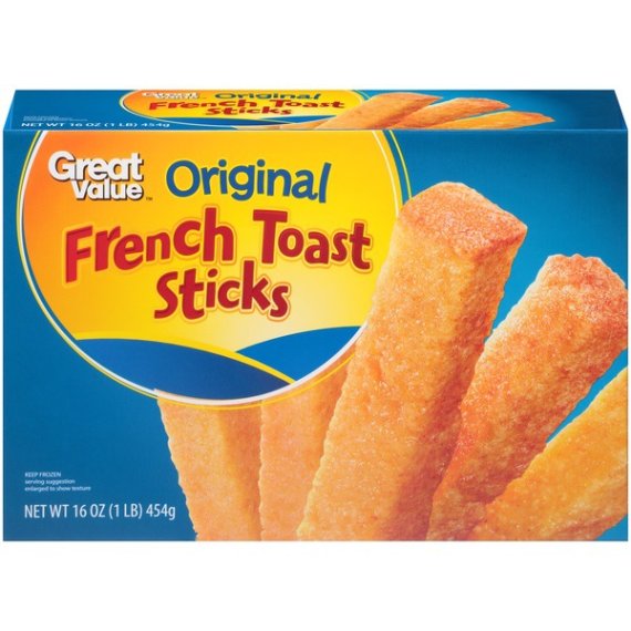 Details Ingredients ENRICHED BREAD (ENRICHED WHEAT FLOUR [ WHEAT FLOUR, MALTED BARLEY FLOUR, NIACIN, IRON, THIAMINE MONONITRATE, RIBOFLAVIN, FOLIC ACID]. WATER, HIGH FRUCTOSE CORN SYRUP, YEAST, CONTAINS 2% OR LESS OF EACH OF THE FOLLOWING: SALT, YELLOW CORN FLOUR, SOYBEAN OIL, DATEM, SOY FLOUR, MONO AND DIGLYCERIDES, SODIUM STEAROYL LACTYLATE, ASCORBIC ACID, AZODICARBONAMIDE, ARTIFICIAL FLAVOR, ENZYMES, MONOCALCIUM PHOSPHATE, SOY LECITHIN. CALCIUM SULFATE, AMMONIUM SULFATE, CALCIUM PEROXIDE, CALCIUM PROPIONATE [ A PRESERVATIVE]), WATER, SOYBEAN OIL, SUGAR, WHEAT FLOUR, YELLOW CORN FLOUR, BLEACHED WHEAT FLOUR, ENRICHED WHEAT FLOUR (WHEAT FLOUR, NIACIN, IRON, THIAMINE MONONITRATE, RIBOFLAVIN, FOLIC ACID), CONTAINS 2% OR LESS OF EACH OF THE FOLLOWING: MODIFIED FOOD STARCH, SALT, DEXTROSE, NONFAT DRY MILK, WHOLE EGG POWDER, NATURAL AND ARTIFICIAL FLAVOR, SODIUM BICARBONATE, SOY FLOUR, SODIUM ALUMINUM PHOSPHATE, SPICE, MONOCALCIUM PHOSPHATE, YEAST. Show more Product features Great Value Original French Toast Sticks are a great and easy way to start your morning right. Ready to eat in one minute and fifteen seconds, our hearty French Toast sticks are a convenient meal or snack that anyone can make. These will go great with syrup or powdered sugar, and are a great complement to things like bacon or alongside a bowl of fruit. These could also be a sweet afternoon treat that will energize you for the rest of your day. Be prepared for your mornings with Great Value Original French Toast Sticks. Great Value products provide families with affordable, high quality grocery and household consumable options. With our wide range of product categories spanning grocery and household consumables, we offer you a variety of products for your family's needs. Our products are conveniently available online and in Walmart stores nationwide, allowing you to stock up and save money at the same time Great Value Original French Toast Sticks, 16 oz.: Perfect for your next convenient breakfast Frozen to last longer Great with bacon or alongside a bowl of fruit Thick slices of bread, cut into sticks, and lightly fried No artificial colors Special Features No artificial colors Net Quantity of Content 4.0 X 4 oz