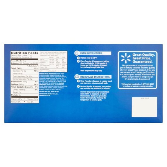 Details Ingredients PANCAKE BATTER INGREDIENTS: WATER, WHEAT FLOUR (BLEACHED), SUGAR, SOYBEAN OIL, SOY FLOUR, LEAVENING (SODIUM ACID PYROPHOSPHATE, SODIUM BICARBONATE), EGGS, DEXTROSE, SALT, ARTIFICIAL FLAVOR, NONFAT DRY MILK, COOKED IN VEGETABLE OIL (CONTAINS ONE OR MORE OF CORN OIL, COTTONSEED OIL, SOYBEAN OIL) SAUSAGE INGREDIENTS: PORK, WATER, IMITATION MAPLE FLAVOR (SUGAR, SALT, MALTODEXTRIN, SPICES, CORN SYRUP SOLIDS, NATURAL FLAVORS, ARTIFICIAL FLAVORS, CITRIC ACID, PROPYL GALLATE) Show more Product features Add an element of fun to your morning breakfast with these Great Value Pancakes and Sausage on a Stick. Featuring savory sausage links wrapped in a golden pancake batter, they are the perfect fun and delicious breakfast that the whole family will love. They are made of wholesome ingredients and are USDA inspected for quality assurance. The frozen pancakes and sausage links are fully cooked, so you can just heat them in the oven or the microwave. Pair them with a side of fresh fruit and enjoy with a hot cup of coffee or tea for a well-rounded breakfast. Bring home a box of Great Value Pancakes and Sausage on a Stick. Great Value products provide families with affordable, high quality grocery and household consumable options. With our wide range of product categories spanning grocery and household consumables, we offer you a variety of products for your family's needs. Our products are conveniently available online and in Walmart stores nationwide, allowing you to stock up and save money at the same time. Great Value Pancakes & Sausage on a Stick, Family Size, 25 oz, 10 Count: Fully cooked Perfect for a quick and easy yet delicious breakfast Family size Natural and artificial flavor USDA Inspected Net Quantity of Content 10 X 71 g