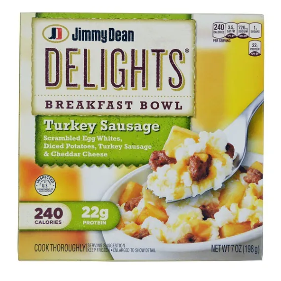Details Ingredients PRECOOKED SCRAMBLED EGG WHITES (EGG WHITES, MODIFIED CORN STARCH, NONFAT DRY MILK, WHEY PROTEIN ISOLATE, SOYBEAN OIL, CARRAGEENAN, SALT, NATURAL EGG FLAVOR, GUAR GUM, XANTHAN GUM), DICED POTATOES (POTATOES, VEGETABLE OIL [SOYBEAN AND/OR COTTONSEED OILS], MALTODEXTRIN, SALT, DEXTROSE TETRASODIUM PYROPHOSPHATE AND SODIUM ACID PYROPHOSPHATE [TO MAINTAIN NATURAL COLOR]), COOKED TURKEY SAUSAGE CRUMBLES CARAMEL COLOR ADDED, BHT AND CITRIC ACID ADDED TO HELP PROTECT FLAVOR (TURKEY, SEASONING [SALT, DEXTROSE, SUGAR, SPICES, BHT, CITRIC ACID], CARAMEL COLOR, COOKED IN BEEF FAT), REDUCED FAT SHREDDED MILD CHEDDAR CHEESE (PASTEURIZED PART-SKIM MILK, CHEESE CULTURE, SALT, ENZYMES, ANNATTO COLOR, VITAMIN A), WATER. Show more Product features All of your breakfast favorites together in one bowl. Filled with seasoned turkey sausage crumbles, fluffy egg whites, diced potatoes and real cheddar cheese, Jimmy Dean Delights® Turkey Sausage Breakfast Bowls are sure to be the best part of your morning. With 18 grams of protein per serving, it's the perfect protein-packed option for your breakfast routine. Simple to prepare and ready in minutes, our breakfast bowls are made with premium ingredients and the Jimmy Dean® quality you know and trust. Just microwave and serve for a delicious breakfast at home or on-the-go. Includes one single serving Turkey Sausage Breakfast Bowl. At Jimmy Dean® Brand, we believe that when you have a good breakfast you have a good day, and you can even pass that sunshine on to others. And if everyone has a great day, imagine all the good we can do. So let’s do it - let’s shine it forward and make this world a brighter place one breakfast at a time. One, 7 oz. Jimmy Dean Delights® Turkey Sausage Breakfast Bowl Features seasoned turkey sausage crumbles, fluffy egg whites, diced potatoes and real cheddar cheese 18 grams of protein per serving Ready in minutes and easy to prepare Made with premium ingredients Convenient, single serve bowl Special Features Less than 1/2 the calories. Less than 1/2 the fat Net Quantity of Content 1 X 198 g
