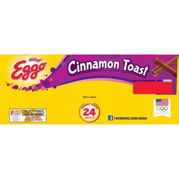 Details Ingredients ENRICHED FLOUR (WHEAT FLOUR, NIACIN, REDUCED IRON, VITAMIN B1 [THIAMIN MONONITRATE], VITAMIN B2 [RIBOFLAVIN], FOLIC ACID), WATER, SUGAR, VEGETABLE OIL (SOYBEAN, PALM OIL AND/OR CANOLA OIL), EGGS, CONTAINS 2% OR LESS OF LEAVENING (BAKING SODA, SODIUM ALUMINUM PHOSPHATE, MONOCALCIUM PHOSPHATE), CINNAMON, SALT, WHEY, SOY LECITHIN. VITAMINS AND MINERALS: CALCIUM CARBONATE, VITAMIN A PALMITATE, REDUCED IRON, NIACINAMIDE, VITAMIN B12, VITAMIN B6 (PYRIDOXINE HYDROCHLORIDE), VITAMIN B1 (THIAMIN HYDROCHLORIDE), VITAMIN B2 (RIBOFLAVIN). Show more Product features Wake up and greet the day with the feel-good taste of Eggo Cinnamon Toast Waffles. Crafted with delicious ingredients and with a touch of cinnamon flavor, our waffles are a perfect balance of crispy, fluffy goodness. Convenient and easy to prepare, Eggo Cinnamon Toast Waffles bring warmth to busy mornings. Great for families and individuals, these delicious waffles are made to enjoy as a stand-alone breakfast treat or with your favorite morning toppings like butter and syrup, jellies and preserves, and whipped cream. With no artificial flavors or colors, our waffles also provide a good source of 9 vitamins and minerals. So delicious you can't just L'Eggo! Kellogg's Eggo Cinnamon Toast Waffles Eassy Breakfast 25.8 Oz 24 Ct The yummy flavor of your favorite classic Eggo waffles in a fun, easy-to-hold toast shape; Perfect for little hands to grab-and-go Crisp, golden and fluffy, our waffles are made with delicious ingredients and a touch of delicious cinnamon flavor for an irresistible homemade taste Good source of 9 vitamins and minerals; No artificial flavors or colors; Kosher Dairy Quick, convenient, and easy to prepare; Just pop in the toaster or oven for a warm family-favorite breakfast; Great for kids and adults Includes 1, 25.8-ounce family-sized box containing 24 sets of 4 waffles (96 waffles total); Packaged for great taste Special Features Family pack Net Quantity of Content 8 X 92 g