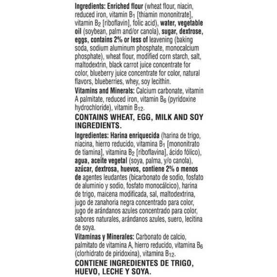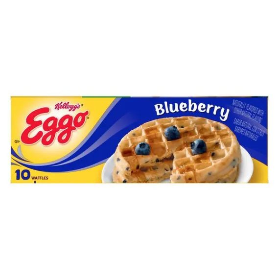 Details Ingredients ENRICHED FLOUR (WHEAT FLOUR, NIACIN, REDUCED IRON, VITAMIN B1 [THIAMIN MONONITRATE], VITAMIN B2 [RIBOFLAVIN], FOLIC ACID), WATER, VEGETABLE OIL (SOYBEAN, PALM AND/OR CANOLA), SUGAR, DEXTROSE, EGGS, CONTAINS 2% OR LESS OF LEAVENING (BAKING SODA, SODIUM ALUMINUM PHOSPHATE, MONOCALCIUM PHOSPHATE), WHEAT FLOUR, MODIFIED CORN STARCH, SALT, MALTODEXTRIN, BLACK CARROT JUICE CONCENTRATE FOR COLOR, BLUEBERRY JUICE CONCENTRATE FOR COLOR, NATURAL FLAVORS, BLUEBERRIES, WHEY, SOY LECITHIN. VITAMINS AND MINERALS: CALCIUM CARBONATE, VITAMIN A PALMITATE, REDUCED IRON, VITAMIN B6 (PYRIDOXINE HYDROCHLORIDE), VITAMIN B12. Show more Product features Wake up and greet the day with the feel-good taste of Eggo Blueberry Waffles. Crafted with delicious ingredients and the perfect amount of yummy blueberry flavor, our waffles are a perfect balance of crispy, fluffy goodness. Convenient and easy to prepare, Eggo Blueberry Waffles bring warmth to busy mornings. Great for families and individuals, these delicious waffles are made to enjoy as a stand-alone breakfast treat or with your favorite morning toppings like butter and syrup, jellies and preserves, and whipped cream. With colors and flavors from natural sources, our waffles also provide a good source of 9 vitamins and minerals. So delicious you can't just L'Eggo! Kellogg's Eggo Frozen Blueberry Waffles Easy Breakfast 12.3 Oz 10 Ct The yummy taste of your favorite classic Eggo waffles with the flavor of sweet berry in every bite Crisp, golden and fluffy, our waffles are made with delicious ingredients and the perfect amount of blueberry flavor for an irresistible homemade taste Good source of 9 vitamins and minerals; Colors and flavors from natural sources; Kosher Dairy Quick, convenient, and easy to prepare; Just pop in the toaster or oven for a warm family-favorite breakfast; Great for kids and adults Includes 1, 12.3-ounce box containing 10 waffles; Packaged for taste Special Features Made with real blueberries Net Quantity of Content 5 X 70 g