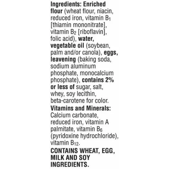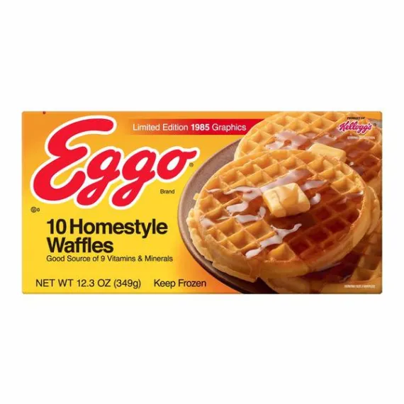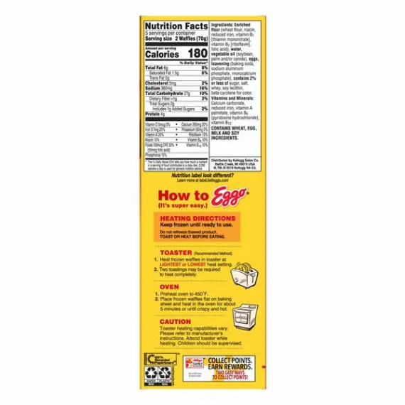 Details Ingredients ENRICHED FLOUR (WHEAT FLOUR, NIACIN, REDUCED IRON, VITAMIN B1 [THIAMIN MONONITRATE], VITAMIN B2 [RIBOFLAVIN], FOLIC ACID), WATER, VEGETABLE OIL (SOYBEAN, PALM AND/OR CANOLA), EGGS, LEAVENING (BAKING SODA, SODIUM ALUMINUM PHOSPHATE, MONOCALCIUM PHOSPHATE), CONTAINS 2% OR LESS OF SUGAR, SALT, WHEY, SOY LECITHIN, BETA-CAROTENE FOR COLOR. VITAMINS AND MINERALS: CALCIUM CARBONATE, REDUCED IRON, VITAMIN A PALMITATE, VITAMIN B6 (PYRIDOXINE HYDROCHLORIDE), VITAMIN B12. Show more Product features Wake up and greet the day with the feel-good taste of Eggo Homestyle Waffles. Crafted with delicious ingredients and cooked on griddles and irons just like in the home kitchen, our waffles are a perfect balance of crispy, fluffy goodness. Convenient and easy to prepare, Eggo Homestyle Waffles bring warmth to busy mornings. Great for families and individuals, these delicious waffles are made to enjoy as a stand-alone breakfast treat or with your favorite morning toppings like butter and syrup, jellies and preserves, and whipped cream. Thinking of taking a turn for the savory? Go ahead and try them with fried chicken, bacon, or sausage, or combine for a delicious waffle sandwich. With colors and flavors from natural sources, our waffles also provide a good source of 9 vitamins and minerals. So delicious you can't just L'Eggo! Kellogg's Eggo Homestyle Waffles 10 ct Box The yummy flavor of your favorite classic Eggo waffles are sure to brighten your mornings Crisp, golden, and fluffy, our waffles are made with delicious ingredients for an irresistible homemade taste Good source of 9 vitamins and minerals; Colors and flavors from natural sources; Kosher Dairy Quick, convenient, and easy to prepare; Just pop in the toaster oven for a warm family-favorite breakfast Includes 1, 12.3-ounce box containing 10 waffles; Packaged for great taste Special Features 0 grams trans fat Net Quantity of Content 5 X 70 g