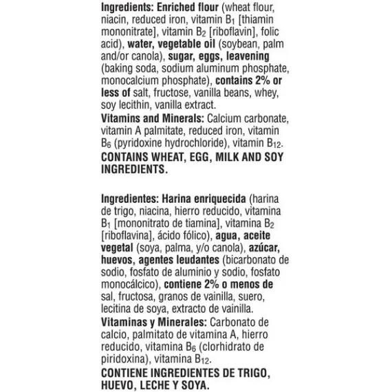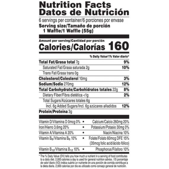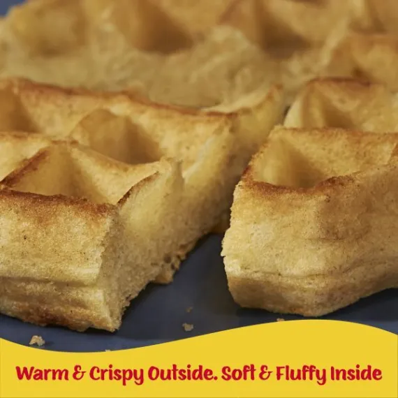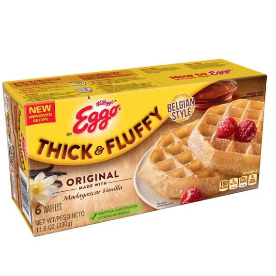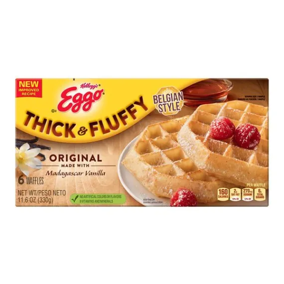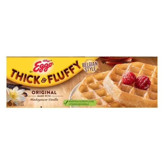 Details Ingredients ENRICHED FLOUR (WHEAT FLOUR, NIACIN, REDUCED IRON, VITAMIN B1 [THIAMIN MONONITRATE], VITAMIN B2 [RIBOFLAVIN], FOLIC ACID), WATER, VEGETABLE OIL (SOYBEAN, PALM AND/OR CANOLA), SUGAR, EGGS, LEAVENING (BAKING SODA, SODIUM ALUMINUM PHOSPHATE, MONOCALCIUM PHOSPHATE), CONTAINS 2% OR LESS OF SALT, FRUCTOSE, VANILLA BEANS, WHEY, SOY LECITHIN, VANILLA EXTRACT. VITAMINS AND MINERALS: CALCIUM CARBONATE, VITAMIN A PALMITATE, REDUCED IRON, VITAMIN B6 (PYRIDOXINE HYDROCHLORIDE), VITAMIN B12. Show more Product features Wake up and greet the day with the feel-good taste of Eggo Thick & Fluffy Original Waffles made with Madagascar vanilla. Crafted with delicious ingredients, our waffles are a perfect balance of crispy, fluffy goodness. Convenient and easy to prepare, Eggo Thick & Fluffy Original Waffles made with Madagascar vanilla bring warmth to busy mornings. Great for families and individuals, these delicious waffles are made to enjoy as a stand-alone breakfast treat or with your favorite morning toppings like butter and syrup, jellies and preserves, and whipped cream. Thinking of taking a turn for the savory? Go ahead and try them with fried chicken, bacon, or sausage, or combine for a delicious waffle sandwich. With no high-fructose corn syrup, and with colors and flavors from natural sources, our waffles also provide a good source of 8 vitamins and minerals. So delicious you just can't L'Eggo! Kellogg’s Eggo, Thick and Fluffy, Frozen Waffles, Original, Easy Breakfast, 11.6 oz 6 Ct The yummy flavor of your favorite classic Eggo waffles in an extra thick Belgian-style shape Crisp, golden, and fluffy, our waffles are made with delicious ingredients for an irresistible, homemade taste Good source of 8 vitamins and minerals; Excellent source of calcium; No high-fructose corn syrup; Colors and flavors from natural sources; Kosher Dairy Quick, convenient, and easy to prepare; Just pop in the toaster or oven for a warm family-favorite breakfast Includes 1, 11.6-ounce box containing 6 waffles; Packaged for great taste Goodness! That's tasty Colors & flavors from natural sources 10 vitamins & minerals Thick and fluffy original recipe Kosher - D The original frozen breakfast option that toasts up to a delicious golden crisp in minutes. Goodness from our Kitchens Made with delicious ingredients for the Taste You Love. facebook.com/eggo Kellogg's Family Rewards® Collect Points. Earn Rewards. No More Codes. Two Easy Ways To Collect Points! Go to KFR.com to learn more. Special Features Excellent source of calcium Net Quantity of Content 6 X 55 g