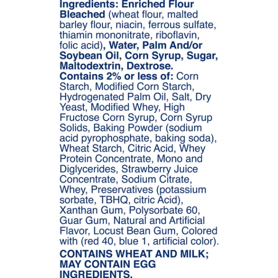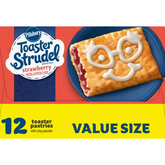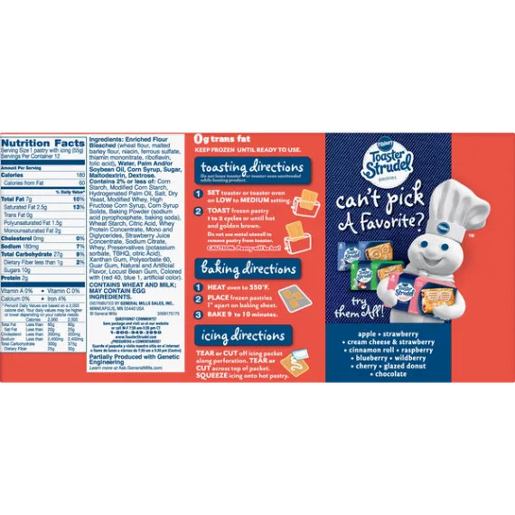 Details Ingredients Enriched Flour Bleached (Wheat Flour, Malted Barley Flour, Niacin, Ferrous Sulfate, Thiamin Mononitrate, Riboflavin, Folic Acid), Water, Palm and/or Soybean Oil, Corn Syrup, Sugar, Maltodextrin, Dextrose. Contains 2% or Less of: Corn Starch, Modified Corn Starch, Hydrogenated Palm Oil, Salt, Dry Yeast, Modified Whey, High Fructose Corn Syrup, Corn Syrup Solids, Baking Powder (Sodium Acid Pyrophosphate, Baking Soda), Wheat Starch, Citric Acid, Whey Protein Concentrate, Mono and Diglycerides, Strawberry Juice Concentrate, Sodium Citrate, Whey, Preservatives (Potassium Sorbate, TBHQ, Citric Acid), Xanthan Gum, Polysorbate 60, Guar Gum, Natural and Artificial Flavor, Locust Bean Gum, Colored with (Red 40, Blue 1, Artificial Color). Show more Product features Make mornings Gooey, Flaky, Happy with Strawberry Toaster Strudels. Delicious treats with sweet filling, creamy icing and flaky crust. Toaster Strudel: Delicious treats with sweet filling, creamy icing and flaky crust Quick and Easy: Just heat up in a toaster for a warm pastry ready in minutes Convenience: Quick and Easy Toaster Strudel pastries for a sweet breakfast treat Try them all: Make mornings Gooey, Flaky, Happy with Toaster Strudel and Strawberry or other Flavors Contains: 23 oz. Box with 12 Frozen Pastries Net Quantity of Content 12 X 1.0
