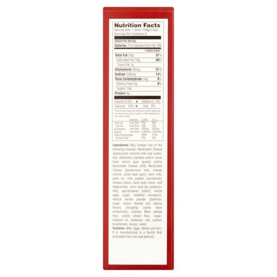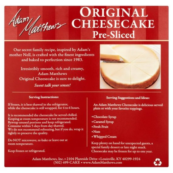 Details Ingredients MAY CONTAIN ONE OF THE FOLLOWING CHEESES: NEUFCHATEL CHEESE (PASTEURIZED CULTURED MILK AND CREAM, SALT, STABILIZERS [XANTHAN AND/OR CAROB BEAN AND/OR GUAR GUMS]) AND/OR NEUFCHATEL CHEESE (MILK, NEUFCHATEL CHEESE [PASTEURIZED MILK, CHEESE CULTURE, CAROB BEAN GUM], SKIM MILK, PALM OIL, MILK PROTEIN CONCENTRATE, CHEESE CULTURE, LACTIC ACID, MONO- AND DIGLYCERIDES, CITRIC ACID [AS PRESERVATIVE], APOCAROTENAL [COLOR]), WHOLE EGGS, SUGAR, MODIFIED CORNSTARCH, NATURAL VANILLA POWDER (DEXTROSE, SUGAR, SILICON DIOXIDE AND NATURAL FLAVORS [INCLUDING VANILLA BEAN EXTRACTIVES]), GRAHAM MEAL (WHEAT FLOUR, WHOLE WHEAT FLOUR, SUGAR, SOYBEAN OIL, MOLASSES, SALT, SODIUM BICARBONATE, HONEY), WATER. Show more Product features Irresistibly smooth, rich and creamy, Adam Matthews cheesecake has been delighting taste buds since 1983. It's made with the finest ingredients and a secret family recipe. Serve this Adams Matthews Original Cheesecake plain or with your favorite toppings, like chocolate sauce, caramel syrup, fresh fruit, nuts, or whipped cream. No matter how you prepare it, it'll make a delicious, spectacular dessert that will wow everyone at the table. This delectable cheesecake comes pre-sliced for your convenience and may be frozen for up to one year, so stock up to have plenty on hand for unexpected guests, a special family dessert or an indulgent late-night snack. Adam Matthews Original Cheesecake, 30 oz: Original flavor Keeps fresh in your freezer for up to 1 year Conveniently pre-sliced Frozen cheesecake, 30 oz Net Quantity of Content 8 X 106 g