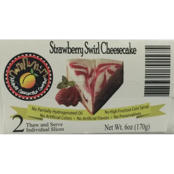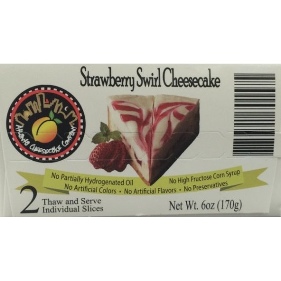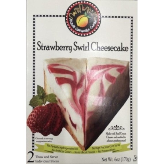 Details Ingredients CULTURED PASTEURIZED MILK, SUGAR, CREAM, BLEACHED WHEAT FLOUR, EGG, HYDROGENATED & PARTIALLY HYDROGENATED SOYBEAN OIL AND/OR COTTONSEED OIL, GRHAM FLOUR, SALT, WHOLE MILK SOLIDS, MOLASSES, MODIFIED FOOD STARCH, STRAWBERRIES, CORN SYRUP, NATURAL & ARTIFICIAL FLAVOR, DEXTROSE, GUAR GUM, NONFAT MILK, CARRAGEENAN, CITRIC ACID, POTASSIUM SORBATE (PRESERVATIVES), SODIUM CITRATE, LOCUST BEAN GUM, TAPIOCA STARCH, SODIUM BICARBONATE (LEAVENING), HONEY, SODIUM PHOSPHATE, XANTHAN GUM, TARA GUM, RED # 40, MONO & DIGLYCERIDES, SODIUM ALGINATE, SOYBEAN LECITHIN, BETA CAROTENE, VITAMIN A PALMITATE, SODIUM BENZOATE (PRESERVATIVE), CALCIUM DISODIUM EDTA (PROTECTS FLAVOR), GLYCEROL, MALTODEXTRIN, ENZYMES, RIBOFLAVIN, FOLIC ACID, IRON, NIACIN, THIAMINE MONONITRATE. Show more Product features Atlanta Cheesecake Company Strawberry Cheesecake features strawberry cheesecake nestled in a traditional graham cracker crust. Delicious served alone or with your favorite garnish, this Atlanta Cheesecake Company cheesecake is sure to leave a lasting impression. It is truly an out-of-the-ordinary dessert! Atlanta Cheesecake Company Strawberry Cheesecake: Strawberry cheesecake in a golden graham crust crowned with fresh sour cream and strawberry swirl fruit 2 delicious slices 0g trans fat Thaw and serve Kosher Atlanta Cheesecake Company Strawberry Cheesecake features strawberry cheesecake nestled in a traditional graham cracker crust. Delicious served alone or with your favorite garnish, this Atlanta Cheesecake Company cheesecake is sure to leave a lasting impression. It is truly an out-of-the-ordinary dessert! Net Quantity of Content 2 X 85 g