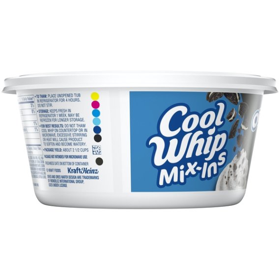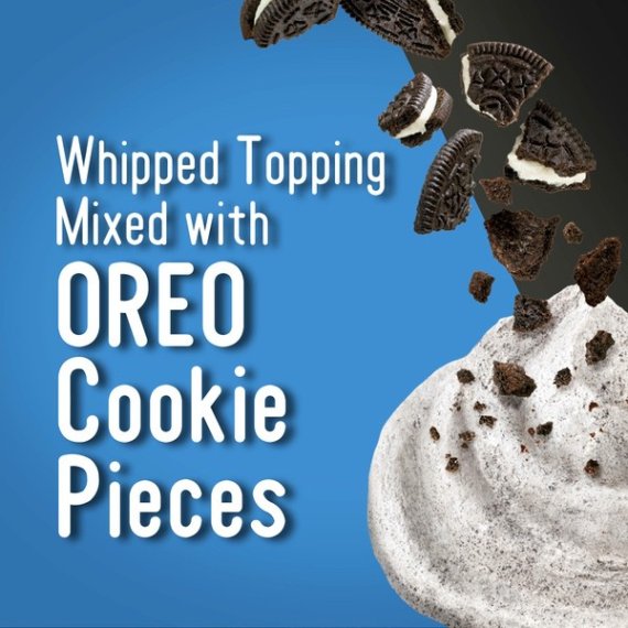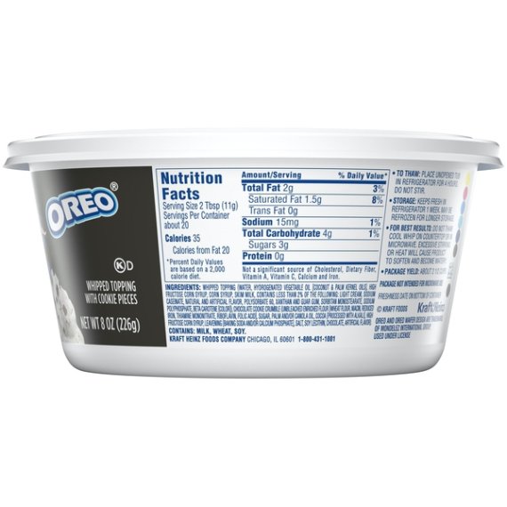 Details Ingredients Whipped Topping (Water, Hydrogenated Vegetable Oil [Coconut & Palm Kernel Oils], High Fructose Corn Syrup, Corn Syrup, Skim Milk, Contains Less Than 2% Of Light Cream, Sodium Caseinate [From Milk], Natural And Artificial Flavor, Polysorbate 60, Xanthan And Guar Gums, Sorbitan Monostearate, Sodium Polyphosphate, Beta Carotene [Color]), Chocolate Cookie Crumble (Unbleached Enriched Flour [Wheat Flour, Niacin, Reduced Iron, Thiamine Mononitrate (Vitamin B1), Riboflavin (Vitamin B2), Folic Acid], Sugar, Palm And/Or Canola Oil, Cocoa [Processed With Alkali], High Fructose Corn Syrup, Leavening [Baking Soda And/Or Calcium Phosphate], Salt, Soy Lecithin, Chocolate, Artificial Flavor). Show more Product features Cool Whip Mix-Ins OREO Cookie Whipped Topping adds a sweet deliciousness to your favorite desserts. Mixed with OREO cookie pieces, this whipped topping brings tasty cookies and cream flavor to any recipe or snack. Simply add as a topping to an ice cream sundae for the perfect finishing touch, top a no bake cake or dollop it on top of chocolate pudding. Layer this Oreo Cookie Mix-Ins whipped topping on a cookie cake for next-level sweetness. The convenient 8 ounce resealable tub keeps the whipped topping fresh. Place unopened tub in refrigerator for 4 hours to thaw. Do not stir. Keeps fresh in refrigerator 2 weeks. May be refrozen for longer storage. One 8 oz. tub of Cool Whip Mix-Ins OREO Cookie Whipped Topping Cool Whip Mix-Ins OREO Cookie Whipped Topping with decadent chocolate cookie pieces Contains tasty OREO cookie pieces to enhance your favorite desserts No trans fat with a total of 2 g. of fat per serving Makes a perfect addition to no bake desserts Keep packaged whipped topping refrigerated to maximize freshness Resealable tub helps to ensure freshness Net Quantity of Content 21.0 X 2 tbsp (11g)