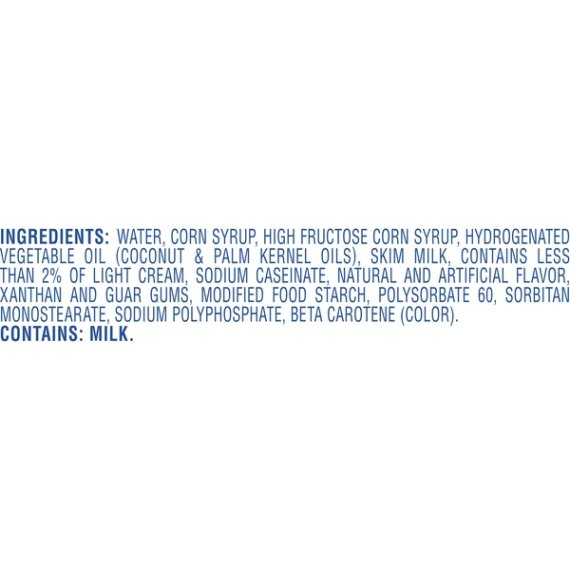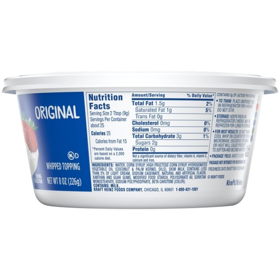 Details Ingredients Water, Corn Syrup, High Fructose Corn Syrup, Hydrogenated Vegetable Oil (Coconut And Palm Kernel Oils), Skim Milk, Contains Less Than 2% Of Light Cream, Sodium Caseinate (From Milk), Natural And Artificial Flavor, Xanthan And Guar Gums, Modified Food Starch, Polysorbate 60, Sorbitan Monostearate, Sodium Polyphosphate, , Beta Carotene (Color). Show more Product features Cool Whip Original Whipped Topping is a one-of-a-kind dessert topping that adds sweet flavor and creamy texture to all your favorite desserts and recipes. With its unique and trusted formula, Cool Whip completes your dessert. Add a dollop of Cool Whip to strawberry shortcake, chocolate pie or banana pudding to take your favorite desserts to the next level. Cool Whip also adds a deliciously creamy texture to fruit salad, or try using it to top off the perfect ice cream sundae. Place unopened 8 ounce tub in refrigerator for 4 hours to thaw. Do not stir. Keeps fresh in refrigerator 2 weeks. May be refrozen for longer storage. One 8 oz. tub of Cool Whip Original Whipped Topping Cool Whip Original Whipped Topping is a one-of-a-kind dessert topping 2 grams of sugar, 1 gram of saturated fat and 1.5 grams of total fat per serving Made with a unique and trusted formula Whipped topping makes it easy to add sweet creaminess to any dessert Add creamy texture to fruit salad, or try using it to top off the perfect ice cream sundae Keep refrigerated to maximize freshness Special Features Contains 0g of lactose per serving Net Quantity of Content 25.0 X 2 Tbsp (9g)
