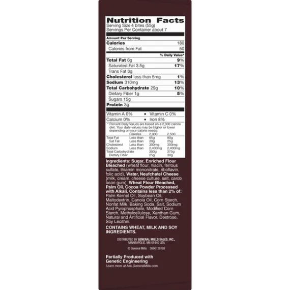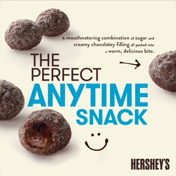 Details Ingredients Sugar, Enriched Flour Bleached (Wheat Flour, Niacin, Ferrous Sulfate, Thiamin Mononitrate, Riboflavin, Folic Acid), Water, Neufchatel Cheese (Milk, Cream, Cheese Culture, Salt, Carob Bean Gum), Wheat Flour Bleached, Palm Oil, Cocoa Powder Processed with Alkali. Contains Less than 2% of: Palm Kernel Oil, Soybean Oil, Maltodextrin, Canola Oil, Corn Starch, Nonfat Milk, Baking Soda, Salt, Sodium Acid Pyrophosphate, Modified Corn Starch, Methylcellulose, Xanthan Gum, Natural and Artificial Flavor, Dextrose, Soy Lecithin. Show more Product features Hershey’s Soft Donut Bites With A Sweet & Creamy Chocolatey Filling are a mouthwatering combination of sugar and creamy chocolatey filling all packed into a warm, delicious bite. Ready in 30 Seconds Box Tops For Education Net Quantity of Content ABOUT 7 X 4.0