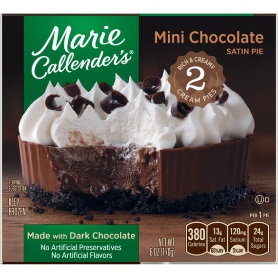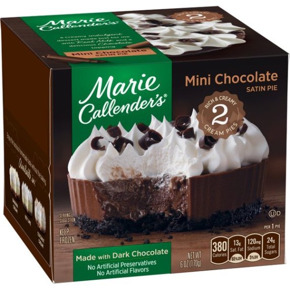Details Ingredients Sugar, Soybean Oil, Water, Wheat Flour, Eggs, Cocoa Powder, Milk, Butter (Cream, Salt), Hydrogenated Palm Kernel Oil, Palm Oil, Semi-Sweet Chocolate (Sugar, Chocolate Liquor, Cocoa Butter, Milk Fat, Soy Lecithin, Natural Flavor), High Fructose Corn Syrup, Hydrogenated Soybean Oil, Contains less than 2% of: Margarine (Palm Oil, Water, Soybean Oil, Salt, Contains less than 2% of Natural Flavor, Soy Lecithin, Beta Carotene [Color], Vitamin A Palmitate Added), Honey, Salt, Chocolate Liquor, Sodium Bicarbonate, Soy Lecithin, Whey, Beta Carotene (Color), Dextrose, Guar Gum, Natural Flavors, Polysorbate 60, Sodium Caseinate, Sorbitan Monostearate, Xanthan Gum, Mono- and Diglycerides, Modified Corn Starch, Sodium Phosphate, Sodium Alginate, Calcium Sulfate, Dextrin, Vitamin D3. CONTIANS: EGG, MILK, SOY, WHEAT.THIS PRODUCT IS MANUFACTURED ON SHARED EQUIPMENT WITH TREE NUT CONTAINING PRODUCTS. Show more Product features Finish any meal with the comforting, homemade taste of Marie Callender's mini pies. Treat family, friends, and yourself in a pinch with this delicious cream pie, perfect for one on any occasion. Indulge in velvety, decadent chocolate, finished with whipped topping and chocolate curls—in a single-serving size. Cookie crumb crust makes each bite satisfying. Thaw while you're entertaining or preparing dinner and serve after for a treat that tastes homemade. This 6-ounce (212g) package contains two mini pies with 350 calories and 0g trans fat each; contains milk and wheat, and is manufactured on shared equipment with products containing eggs, soy, and other tree nuts. Enjoy the combination of fine ingredients and the love and care baked into Marie Callender's recipes for the comforting taste of delicious, homemade goodness. Treat family, friends, and yourself in a pinch with this delicious cream pie, perfect for one on any occasion. Indulge in velvety, decadent chocolate, finished with whipped topping and chocolate curls—in a single-serving size. Cookie crumb crust makes each bite satisfying. Thaw while you're entertaining or preparing dinner and serve after for a treat that tastes homemade. This 6-ounce (212g) package contains two mini pies with 350 calories and 0g trans fat each; contains milk and wheat, and is manufactured on shared equipment with products containing eggs, soy, and other tree nuts. Enjoy the combination of fine ingredients and the love and care baked into Marie Callender's recipes for the comforting taste of delicious, homemade goodness. Net Quantity of Content 1.0 X 85g
