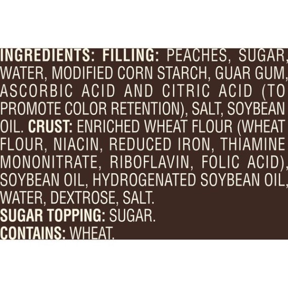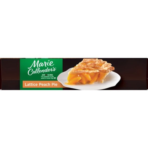 Details       Ingredients  Filling: Peaches, Sugar, Water, Modified Corn Starch, Guar Gum, Ascorbic Acid and Citric Acid (To Promote Color Retention), Salt, Soybean Oil. Crust: Enriched Wheat Flour (Wheat Flour, Niacin, Reduced Iron, Thiamine Mononitrate, Riboflavin, Folic Acid), Soybean Oil, Hydrogenated Soybean Oil, Water, Dextrose, Salt. Sugar Topping: Sugar. CONTAINS: WHEAT.      Show more      Product features  Finish any meal with the comforting, homemade taste of Marie Callender's pies. Treat family, friends, and yourself in a pinch with this delicious peach pie, perfect for sharing on any occasion. Lightly glazed, juicy Freestone peaches in an elegant made-from-scratch lattice crust, sprinkled with sugar and baked to perfection will satisfy your sweet tooth. Flaky made-from-scratch crust makes each bite enjoyable. Bake this pie in the oven and serve warm. Serve with ice cream or whipped cream for an extra-special treat that tastes like it's homemade. This box contains one 40-ounce (1.13kg) pie with nine recommended servings, each with 360 calories and 0g trans fat; contains wheat. Enjoy the combination of fine ingredients and the love and care baked into Marie Callender's recipes for the comforting taste of delicious, homemade goodness.     Treat family, friends, and yourself in a pinch with this delicious peach pie, perfect for sharing on any occasion.   Lightly glazed, juicy Freestone peaches in an elegant made-from-scratch lattice crust, sprinkled with sugar and baked to perfection will satisfy your sweet tooth.   Flaky made-from-scratch crust makes each bite enjoyable.   Bake this pie in the oven and serve warm. Serve with ice cream or whipped cream for an extra-special treat that tastes like it's homemade.   This box contains one 40-ounce (1.13kg) pie with nine recommended servings, each with 360 calories and 0g trans fat; contains wheat.   Enjoy the combination of fine ingredients and the love and care baked into Marie Callender's recipes for the comforting taste of delicious, homemade goodness.       Net Quantity of Content   9.0 X 126g