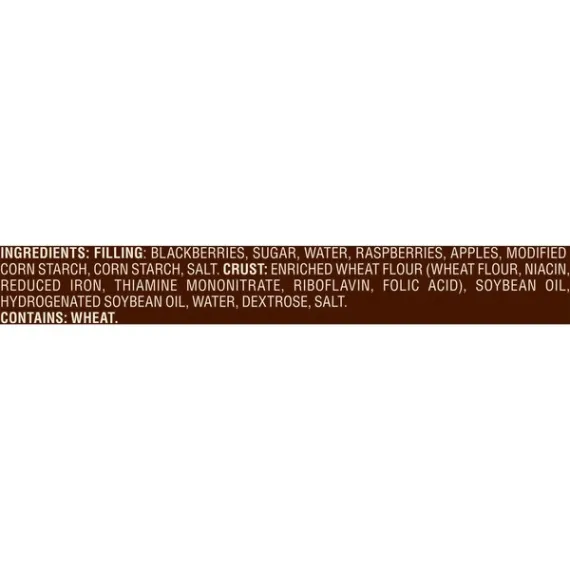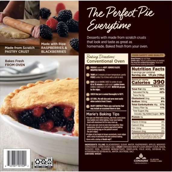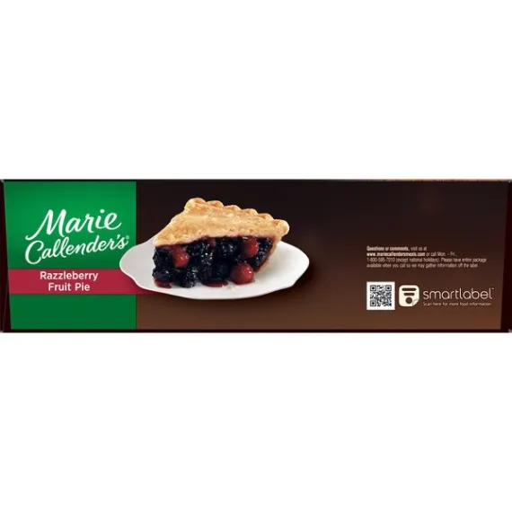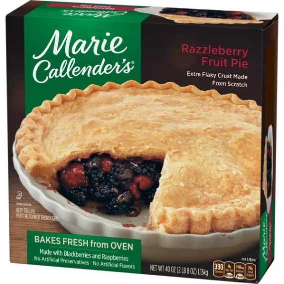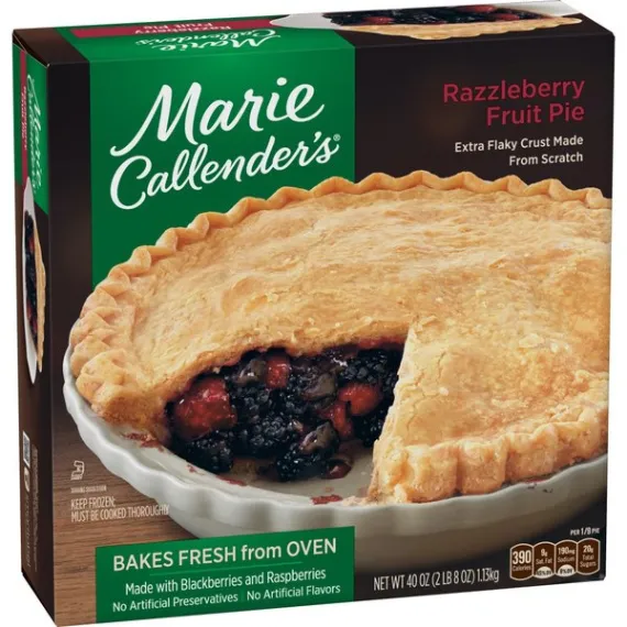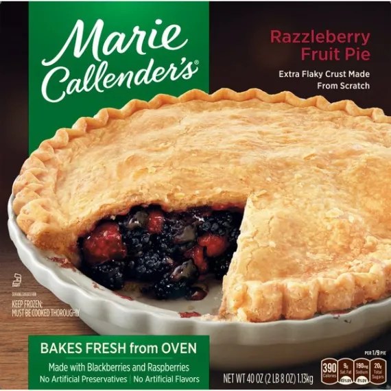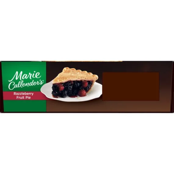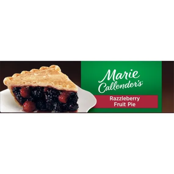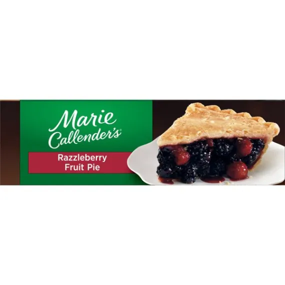Details Ingredients Filling: Blackberries, Sugar, Water, Raspberries, Apples, Modified Corn Starch, Corn Starch, Salt. Crust: Enriched Wheat Flour (Wheat Flour, Niacin, Reduced Iron, Thiamine Mononitrate, Riboflavin, Folic Acid), Soybean Oil, Hydrogenated Soybean Oil, Water, Dextrose, Salt. CONTAINS: WHEAT. Show more Product features Give your taste buds a real treat that's daring, delightful, and delicious with Marie Callender's Razzleberry Pie, 40 oz. It combines the ideal pairing of sweet, juicy blackberries and ripe red raspberries by baking them together in her legendary, made-from-scratch flaky pastry crust. To further enhance the flavor of this Marie Callender's dessert add a dollop of Reddi Wip topping. It has no artificial flavors, no cholesterol and provides 2g of protein and 390 calories per serving. Marie Callender's Razzleberry Pie, 40 oz, is both delicious and convenient.. Marie's story begins over 60 years ago when Marie Callender first baked pies for local restaurants. Marie used only the finest ingredients and put such love and care into every pie--and soon she began offering her home cooking and legendary pies at a pie shop of her own. Now you can enjoy the warmth and goodness of Marie's freshly baked pies at home with Marie Callender's Razzleberry Pie. Marie creates the perfect pairing of ripe red raspberries and sweet, juicy blackberries by baking them together in her legendary flaky pastry crust. The combination is daring, delightful, and downright delicious. Marie Callender's Razzleberry Pie: Extra-flaky crust made from scratch Made with raspberries and blackberries "From my kitchen to yours since 1948" Fruit pie 2g protein, 390 calories per serving Frozen razzleberry pie, 40 oz. Special Features Famous flaky crust Net Quantity of Content 9.0 X 126g