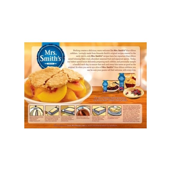 Details       Ingredients  FILLING: PEACHES, WATER, HIGH FRUCTOSE CORN SYRUP, CORN SYRUP, SUGAR, MODIFIED FOOD STARCH, CONTAINS 2% OR LESS: SALT, SPICE, ANNATTO (COLOR). CRUST: WHEAT FLOUR, PALM OIL, WATER, SOYBEAN OIL, CONTAINS 2% OR LESS: SALT, DEXTROSE, CORN SYRUP SOLIDS, MONO- AND DIGLYCERIDES, SODIUM BICARBONATE, WHEY.      Show more      Product features  Cobbler, Peach, Box 32 OZ Cobbler with a flaky crust made with real butter. Since 1919. No artificial sweeteners or flavors. No high fructose corn syrup. 0 grams of trans fat (See nutrition information for saturated fat content). Just like homemade our cobblers do not contain: high fructose corn syrup; artificial sweeteners or flavors. Nothing creates a delicious, warm welcome like Mrs. Smith's blue ribbon cobblers. Lovingly made from Amanda Smith's original recipes created in the early 1900s, only Mrs. Smith's recipes have her signature blue ribbon award-winning flaky crust, made with a touch of real sweet cream butter, abundant seasonal fruit and signature spices. Today, our bakers spend hours delicately preparing each cobbler, and personally sample a handful each day to ensure that each and every cobbler tastes as good as the original. So when you serve Mrs. Smith's blue ribbon cobbler, you can be sure your guests will feel welcome with every bite. For more freshly baked goodness, try all our pies, cobblers & pie shells. Please visit us at www.MrsSmiths.com for more information about our products. Questions or comments? Please include the proof of purchase panel when writing to: Consumer Affairs Dep't., 1604 Superior Rd. Marshall, MN 56258. Call us at: 877-756-4746, or visit our website at: www.Mrssmiths.com. Keep frozen. Bake before serving. Remove cobbler from freezer. Place oven rack in center position. Preheat oven to 400 degrees F. Remove frozen cobbler from box, and remove plastic overwrap from cobbler. Do not remove cobber from original plan. Center frozen cobbler on a cookie sheet lined with aluminum foil and place in preheated oven. Bake cobbler for 55-65 minutes until golden brown. Remove cobbler on cookie sheet from oven using oven mitts. Never handle by edge of pan. Serve warm in 30 minutes or cooled after 2 hours. Store leftover baked cobbler loosely covered in the refrigerator for up to 3 days. Keep frozen until ready to bake. For a shiny, crispier crust, beat one egg and apply with a pastry brush to top crust prior to baking. Please Note: Baking cobbler on cookie sheet helps crust to bake more evenly. For food safety and quality cook before eating to an internal temperature of 160 degrees F. Contains: wheat, milk. 32 oz (2 lbs) 907 g Marshall, MN 56258 877-756-4746 2016     Peach Cobbler   Cobbler with a flaky crust made with real butter. Since 1919. No artificial sweeteners or flavors. No high fructose corn syrup. 0 grams of trans fat (See nutrition information for saturated fat content). Just like homemade our cobblers do not contain: high fructose corn syrup; artificial sweeteners or flavors. Nothing creates a delicious, warm welcome like Mrs. Smith's blue ribbon cobblers. Lovingly made from Amanda Smith's original recipes created in the early 1900s, only Mrs. Smith's recipes have her signature blue ribbon award-winning flaky crust, made with a touch of real sweet cream butter, abundant seasonal fruit and signature spices. Today, our bakers spend hours delicately preparing each cobbler, and personally sample a handful each day to ensure that each and every cobbler tastes as good as the original. So when you serve Mrs. Smith's blue ribbon cobbler, you can be sure your guests will feel welcome with every bite. For more freshly baked goodness, try all our pies, cobblers & pie shells. Please visit us at www.MrsSmiths.com for more information about our products. Questions or comments? Please include the proof of purchase panel when writing to: Consumer Affairs Dep't., 1604 Superior Rd. Marshall, MN 56258. Call us at: 877-756-4746, or visit our website at: www.Mrssmiths.com.       Special Features  Oven bake for 55minutes    Net Quantity of Content   8 X 113 g