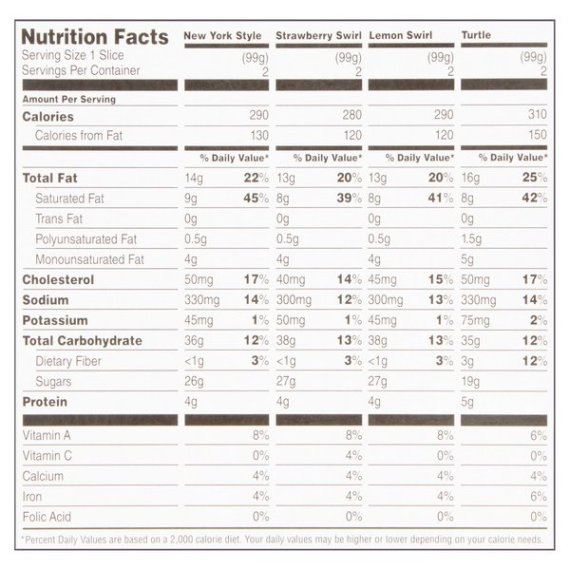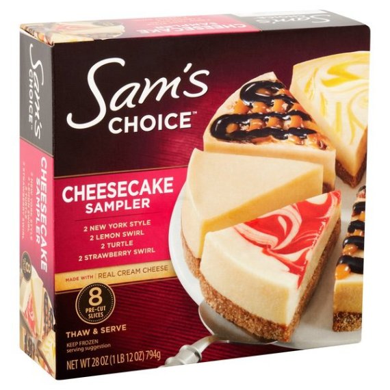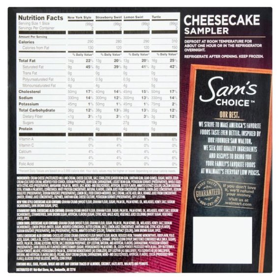 Details       Ingredients  Cream Cheese Blend (Cream Cheese [Pasteurized Milk And Cream, Bacterial Culture, Carob Bean Gum, Xanthan Gum, Guar Gum], Water, Whey Protein Concentrate, Food Starch-Modified, Salt, Cream, Lactic Acid, Milk, Potassium Sorbate [Preservative], Natural Flavor, Enzymes), Sugar, Eggs, Sour Cream (Cultured Cream, Food Starch-Modified, Sodium Phosphate, Guar Gum, Carrageenan, Locust Bean Gum, Potassium Sorbate [Preservative]), Margarine (Palm Oil, Water, Salt, Mono- And Diglycerides, Artificial Flavor, Annatto Color, Calcium Disodium Edta [Preservative], Vitamin A Palmitate), Modified Cornstarch, Vanilla Extract, Water, Concentrated Orange Juice, Lemon Juice from Concentrate. New York Style Also Contains: Graham Crackers (Wheat Flour, Whole Wheat Flour, Graham Flour, Sugar, Palm Oil, Palm Kernel Oil, Molasses, Honey, Salt, Sodium Bicarbonate), Brown Sugar, Cinnamon. Strawberry Swirl Also Contains: Graham Crackers (Unbleached Wheat Flour, Whole Wheat Flour, Graham Flour, Sugar, Palm Oil, Palm Kernel Oil, Molasses, Honey, Salt, Sodium Bicarbonate), Water, Brown Sugar, Strawberries, Strawberry Flavor (Water, Sugar, Propylene Glycol, Citric Acid, Alcohol, Malic Acid, Natural And Artificial Strawberry Flavor), Red 40, Cinnamon. Lemon Swirl Also Contains: Graham Crackers (Wheat Flour, Whole Wheat Flour, Graham Flour, Sugar, Palm Oil, Palm Kernel Oil, Molasses, Honey, Salt, Sodium Bicarbonate), Naturally And Artificially Flavored Lemon Filling (Water, High Fructose Corn Syrup, Sugar, Food Starch-Modified, Partially Hydrogenated Soybean Oil, Dextrose, Lemon Juice Powder, Citric Acid, Agar-Agar, Salt, Natural And Artificial Flavor, Sodium Citrate, Sodium Benzoate And Potassium Sorbate [Used As Preservatives], Titanium Dioxide Color, FD&C Yellow #5), Brown Sugar, Cinnamon.      Show more      Product features   Sam's Choice Cheesecake Sampler offers four delectable classic cheesecake flavors in one convenient pack ensuring there is something for everyone in the family to enjoy. This pack contains eight pre-cut slices, two of each kind, of classic cheesecake flavors including New York Style, Lemon Swirl, Strawberry Swirl, and Turtle. These cheesecakes are made with real cream cheese for delectable and indulgent flavor in each bite. They are perfect after-dinner dessert whether you are at home with your family or hosting your near and dear ones. Bring home Sam’s Choice Cheesecake Sampler today!   Named after our iconic founder, Walmart's Sam's Choice brand provides families with premium, high-quality food and grocery options with the best value. With our wide range of products spanning grocery, packaged food, pre-packaged deli, dairy, and frozen food, we offer you a tailored assortment that is both innovative and enticing. Our authentic products are inspired by our proud heritage and are trusted today by the millions of customers using them across the nation.      Sam's Choice Cheesecake Sampler:     Assortment of four delicious flavors: New York Style, Lemon Swirl, Strawberry Swirl, and Turtle   Made with real cream cheese   8 pre-cut slices   Great for any special occasion   Collection of some of the favorite cheesecake flavors       Net Quantity of Content   2 X 99 G