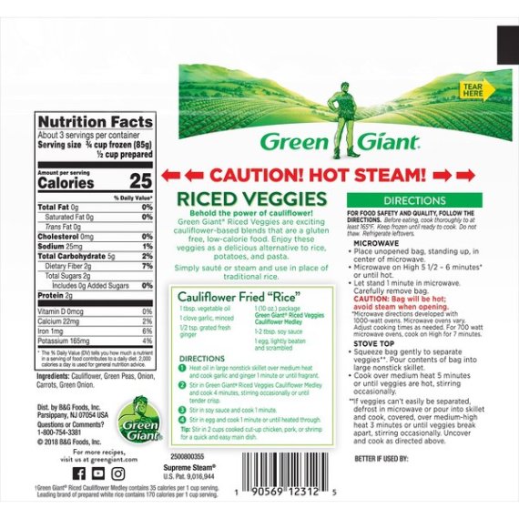 Details Ingredients CAULIFLOWER, GREEN PEAS, ONION, CARROTS, GREEN ONION. Product features Cauliflower Medley, Riced Veggies, Pouch 12 OZ 100% vegetables. Gluten free. No sauce or seasoning. 5 g carbs per serving. 85% fewer calories than rice (85% fewer calories than the leading brand of prepared white rice) (Green Giant Riced Cauliflower Medley contains 25 calories per 1 cup serving. Leading brand of prepared white rice contains 170 calories per 1 cup serving). Behold the power of cauliflower. Green Giant Riced Veggies are exciting cauliflower-based blends that are a gluten-free, low-calorie food. Enjoy as a great alternative to rice, potatoes, and pasta. These veggies are ready for roasting, baking, sauteing, mashing or steaming. Questions or comments? 1-800-754-3381. For more recipes, visit us at greengiant.com. Facebook. YouTube. Instagram. Product of USA/Mex/China. Caution! Hot steam! 12 oz (340 g) Parsippany, NJ 07054 800-754-3381 2017 B&G Foods, Inc. Riced Veggies, Cauliflower Medley 100% vegetables. Gluten free. No sauce or seasoning. 5 g carbs per serving. 85% fewer calories than rice (85% fewer calories than the leading brand of prepared white rice) (Green Giant Riced Cauliflower Medley contains 25 calories per 1 cup serving. Leading brand of prepared white rice contains 170 calories per 1 cup serving). Behold the power of cauliflower. Green Giant Riced Veggies are exciting cauliflower-based blends that are a gluten-free, low-calorie food. Enjoy as a great alternative to rice, potatoes, and pasta. These veggies are ready for roasting, baking, sauteing, mashing or steaming. Questions or comments? 1-800-754-3381. Facebook. YouTube. Instagram. Product of USA/Mex/Canada. Net Quantity of Content ABOUT 3 X 85 g