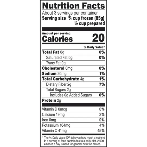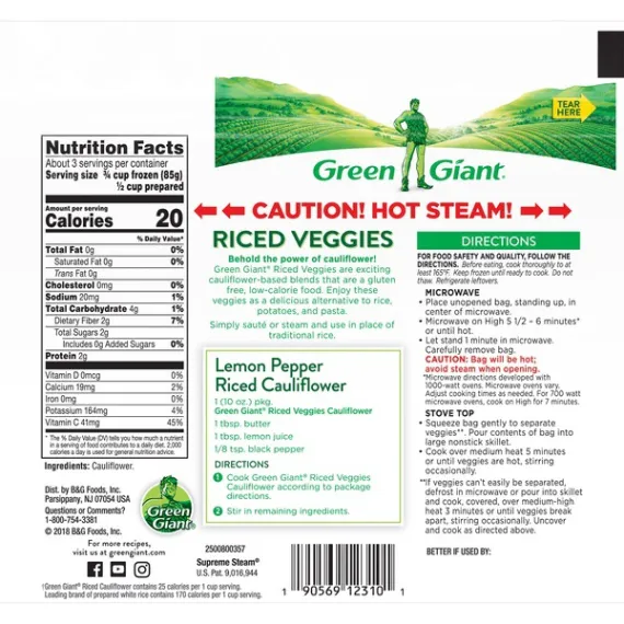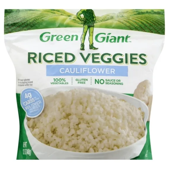 Details Ingredients CAULIFLOWER. Product features Green Giant Cauliflower Riced Veggies, 12 oz, is a tasty new way to eat vegetables. It is a gluten-free, low-carb and low-calorie food. Enjoy Green Giant riced veggies cauliflower as an alternative to rice, potatoes and pasta. It is ideal for roasting, baking, sauteing, mashing or steaming. In addition, this grated cauliflower has 85 percent fewer calories than traditional rice. It is also easy to make by simply popping the bag in the microwave. The package also has a recipe to inspire your culinary creativity. This cauliflower rice does not contain sauce or seasoning. Green Giant Cauliflower Rice, 12 oz: Frozen, riced veggies are ready to heat up No sauce or seasoning; just 100% vegetables 12 oz of cauliflower per bag Just 20 calories per serving No fat or cholesterol Low sodium Prepare in the microwave or on the stovetop Net Quantity of Content ABOUT 3 X 3/4 cup