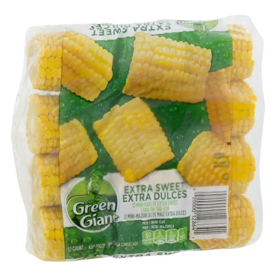 Details Ingredients Sweet Corn-On-The-Cob. Product features Corn-on-the-Cob, Mini, Extra Sweet, Shrink Wrapped 12 CT Per 1 Mini Ear: 50 calories; 0 g sat fat (0% DV); 0 mg sodium (0% DV); 4 g sugars. Enjoy delicious sweet corn on the cob anytime year round with Nibblers. Available in quantities of 6, 12, and 24 mini-ears of corn. See how we lock freshness at www.GreenGiant.com. Exchange: 1 starch. Carbohydrate Choices: 1. Product of USA. Keep frozen. For food safety and quality, follow the directions and cook thoroughly to at least 160 degrees (F). Keep frozen until ready to use. Because stove-tops and microwaves vary, adjusting cook times and heat settings may be required. Refrigerate leftovers. Stove-Top: 1. Place desired amount of frozen corn-on-the-cob in large sauce pan. Add cold water to cover corn. Heat to boiling water over high heat. 2. Cover; reduce heat slightly. Boil 8-10 minutes or until thoroughly heated. Do not overcook. Remove from water with tongs. Microwave: 1. Place 1/4 cup water and up to 8 ears of frozen corn-on-the-cob in 8-inch square (2-quart) microwavable dish. 2. Cover; microwave on high as directed below, turning corn over halfway through cook time, until throughly heated. Do not overcook. Caution: Hot! Avoid steam! Remove from water with tongs. 2 ears 6 to 12 minutes. 4 ears 10 to 16 minutes. 6 ears 12 to 18 minutes. 8 ears 14 to 20 minutes. Do not refreeze. 12 Ears Minneapolis, MN 55440 800-754-3381 2013 General Mills Corn-On-The-Cob, Mini-Ears, Extra Sweet Per 1 Mini Ear: 50 calories; 0 g sat fat (0% DV); 0 mg sodium (0% DV); 4 g sugars. Enjoy delicious sweet corn on the cob anytime year round with Nibblers. Available in quantities of 6, 12, and 24 mini-ears of corn. See how we lock freshness at www.GreenGiant.com. Exchange: 1 starch. Carbohydrate Choices: 1. Product of USA. Special Features Green giant Net Quantity of Content 12 X 61 g