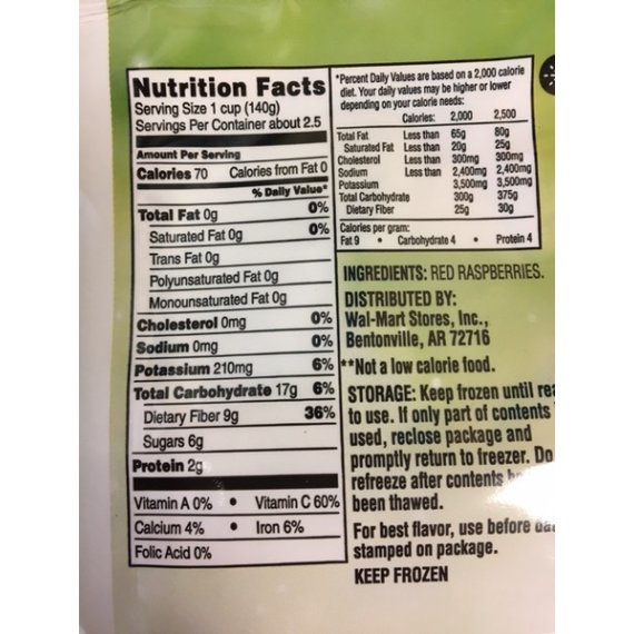 Details Ingredients RED RASPBERRIES. Product features Great Value Red Raspberries are frozen fresh to seal in all their rich fruit flavors. This blend is great for homemade smoothies and snacks. Serve them up plain or topped with whipped cream for a delicious treat. Add to fruit salads, ice cream, yogurt or milkshakes. Use them to top off cereal, pancakes or waffles. They are also great as a topping on cheesecake and other dessert recipes. They offer nutritional benefits as they are a good source of dietary fiber and vitamin C. Enhance the flavors of your smoothies with the addition of Great Value Frozen Red Raspberries. Great Value products provide families with affordable, high quality grocery and household consumable options. With our wide range of product categories spanning grocery and household consumables, we offer you a variety of products for your family's needs. Our products are conveniently available online and in Walmart stores nationwide, allowing you to stock up and save money at the same time. Great Value Whole Red Raspberries, 12 oz: Delicious whole red raspberries High in vitamin C Good Source of Fiber Great for smoothies and toppings No added sugar Reclosable bag to help maintain freshness Special Features Contains natural antioxidants Net Quantity of Content ABOUT 2.5 X 1 cup