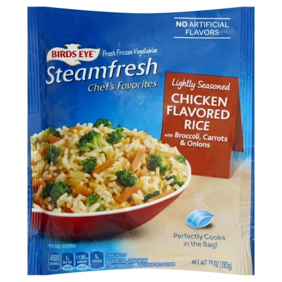 Details Ingredients COOKED RICE (WATER, RICE), BROCCOLI, CARROTS, ONIONS, SEASONING (MALTODEXTRIN, WHEY, SALT, MODIFIED FOOD STARCH, HYDROLYZED CORN PROTEIN, DRIED ONIONS, YEAST EXTRACT, DRIED RED PEPPERS, NATURAL FLAVORS, SOYBEAN OIL, GARLIC POWDER, SPICES, DRIED PARSLEY, CORN SYRUP SOLIDS, TURMERIC POWDER, MONO AND DIGLYCERIDES, SAFFLOWER OIL, SODIUM PHOSPHATE, SODIUM CASEINATE, CHICKEN FAT, GUM ACACIA, SUGAR, DRIED CHICKEN BROTH, SUNFLOWER OIL, ROSEMARY), SOYBEAN OIL. Show more Product features Chicken Flavored Rice, Lightly Seasoned, Steamfresh, Bag 10 OZ Fresh frozen vegetables. No artificial preservatives. Perfectly cooks in the bag! Per 3/4 Cup Serving: 460 calories, 1 sat fat (5% DV), 1130 mg sodium (47% Dv), 5 g sugars. Questions or comments? 888-327-9060 M-F 9:00 am - 5:00 pm. www.bridseye.com. Keep frozen. Do not thaw. Cook thoroughly. See cooking instructions. For food safety & quality follow these directions carefully: Microwave Instructions: Microwave ovens vary - adjust cooking times to reach 165 degrees F as measured by a food thermometer taken in several spots. Keep frozen - Do not thaw. Cook thoroughly to a temperature of 165 degrees F. Cook 1 product at a time. Promptly refrigerate any leftovers. Reheat before serving. 1. Place frozen, unopened bag this side up, laying flat in microwave. Do not pierce bag. For microwaves with metal rack, remove rack. 2. Microwave on high for recommended cook time based on your microwave wattage. During cooking, the bag will slowly inflate. A special vent in the bag will allow the steam to escape and a whistling sound may be heard. 3. Let stand for 1-2 minutes after cooking. Carefully handle bag at corners marked with the red ovals and remove from microwave with two hands. Hold bag over serving dish. Tear bag at notch. Pour, stir and enjoy! Microwave Cook Time: 1200 wattage: 3-1/2 minutes; 1000 wattage: 4 minutes; 800 wattage: 4-1/2 minutes. Stove Top: 1. Empty frozen contents of bag into a 2-quart nonstick sauce pan. Add 2 tablespoons of water. 2. Cook covered over medium heat for 7 to 8 minutes or until heated through, stirring occasionally. 3. Let stand for 1 to 2 minutes. Sauce will thicken as it cooks. Stir well and serve. For microwave ovens less than 800 watts please use stove top instructions. Caution! Contents are hot. Handle with care. Contains: milk. 10 oz (283 g) Darien, WI 53114 888-327-9060 Chicken Flavored Rice, with Broccoli, Carrots & Onions, Lightly Seasoned Fresh frozen vegetables. No artificial preservatives. Perfectly cooks in the bag! Per 3/4 Cup Serving: 460 calories, 1 sat fat (5% DV), 1130 mg sodium (47% Dv), 5 g sugars. Questions or comments? 888-327-9060 M-F 9:00 am - 5:00 pm. www.bridseye.com. Special Features Perfectly steams in the bag Net Quantity of Content 1 X 10 oz