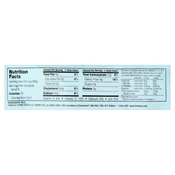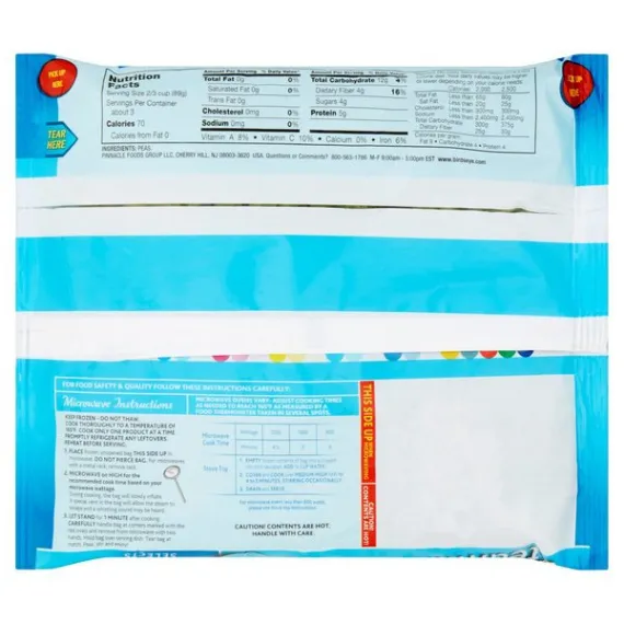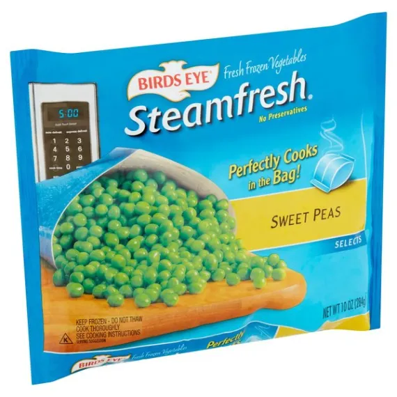 Details Ingredients PEAS. Product features Peas, Sweet, Steamfresh, Bag 10 OZ Selects. Fresh frozen vegetables. No preservatives. Perfectly cooks in the bag! Questions or comments? 800-563-1786 M-F 9:00am - 5:00pm EST. www.birdseye.com. Product of USA. Keep frozen - do not thaw. Cook thoroughly. See cooking instructions. For Food Safety & Quality Follow These Instructions Carefully: Microwave Instructions: Keep frozen - do not thaw. Cook thoroughly to a temperature of 165 degrees F. Cook only one product at a time. Promptly refrigerate any leftovers. Reheat before serving. 1. Place frozen, unopened bag this side up in microwave. Do not pierce bag. For microwaves with a metal rack, remove rack. 2. Microwave on high for the recommended cook time based on your microwave wattage. During cooking, the bag will slowly inflate. A special vent in the bag will allow the steam to escape and a whistling sound may be heard. 3. Let stand for 1 minute after cooking. Carefully handle bag at corners marked with the red ovals and remove from microwave with two hands. Hold bag over serving dish. Tear bag at notch. Pour, stir and enjoy! Microwave ovens vary - adjust cooking times as needed to reach 165 degrees F as measured by a food thermometer taken in several spots. Microwave Cook Time: 1200 Wattage: 4-1/2 minutes; 1000 Wattage: 5 minutes; 800 Wattage: 6 minutes. Stove Top: 1. Empty frozen contents of bag into a 2-quart non-stick saucepan. Add 1/2 cup water. 2. Cover and cook over medium-high heat for 4 to 5 minutes, stirring occasionally. 3. Drain and serve. For microwave ovens less than 800 watts, please use stove top instructions. Caution! Contents are hot! Handle with care. 10 oz (284 g) Cherry Hill, NJ 08003-3620 800-563-1786 Peas, Sweet Selects. Fresh frozen vegetables. No preservatives. Perfectly cooks in the bag! Questions or comments? 800-563-1786 M-F 9:00am - 5:00pm EST. www.birdseye.com. Product of USA. Net Quantity of Content ABOUT 3 X 0.66 cup
