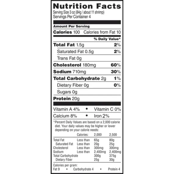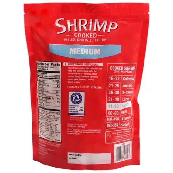 Details Ingredients Shrimp, water, salt, sodium tripolyphosphate (to retain mositure) Product features Our Medium Shrimp are cooked, peeled, deveined, and tail on. These shrimp are ready to thaw and eat. They pair well with a side of steamed red potatoes, garlic roasted broccoli, corn bread and wild rice. They are a great low calorie, lean source of protein. This product is Best Aquaculture Practices certified, making it a responsible seafood choice. Enjoying your favorite seafood is easy with our Cooked Medium Shrimp. Frozen Cooked Medium Peeled & Deveined Tail-On Shrimp, 12 oz: Cooked shrimp, thaw and serve Farm raised Lean source of protein Best Aquaculture Practices 4 Star Certified, https://www.bapcertification.org/ Frozen 41 to 60 shrimp per pound or 30-45 per bag Peeled, Deveined, Tail-On Sweet and firm Net Quantity of Content 4 X 3 oz