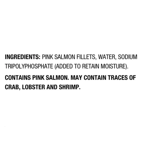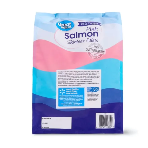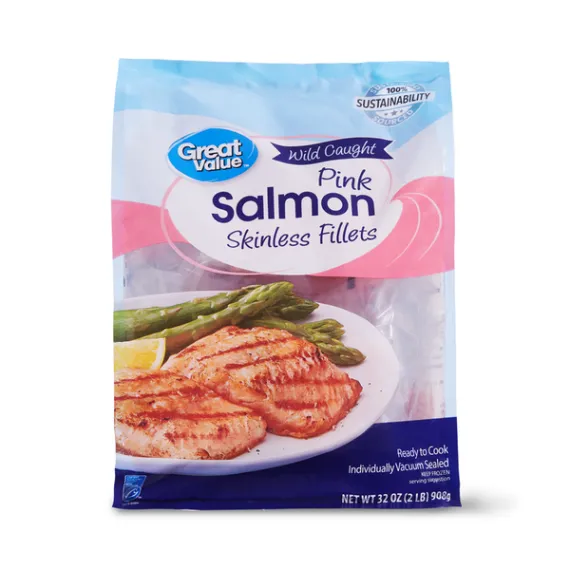 Details Ingredients INGREDIENTS: PINK SALMON FILLETS, SODIUM TRIPOLYPHOSPHATE (ADDED TO RETAIN MOISTURE). Product features Great Value Frozen Wild Caught Pink Salmon Skinless Fillets are made with delicious cuts of all-natural pink salmon. They have a delicate texture and mild to medium flavor that lends itself to variety of cooking methods. Season your fillets with lime juice, chili pepper, and a dash of salt and pepper and serve with a side of refreshing coleslaw, roasted red potatoes and baked carrots for an easy to make meal that the whole family is sure to enjoy. These fillets are great for health-conscious individuals as they do not contain any saturated fat, or trans-fat as well as they are a low-calorie, lean source of protein. They come individually vacuum sealed to help maintain freshness. Enjoy the fresh-from-the-sea taste with these Great Value Frozen Wild Caught Pink Salmon Skinless Fillets. Great Value products provide families with affordable, high-quality grocery and household consumable options. With our wide range of product categories spanning grocery and household consumables, we offer you a variety of products for your family's needs. Our products are conveniently available online and in Walmart stores nationwide, allowing you to stock up and save money at the same time. Great Value Frozen Wild Caught Pink Salmon Skinless Fillets, 32 oz: Wild caught Skinless frozen salmon fillets Individually vacuum sealed Great source of protein Certified sustainable seafood MSC Rich in Omega-3 fatty acids, great source of protein, high in B vitamins Net Quantity of Content 8 X 4 oz (112g/about 1 fillet)