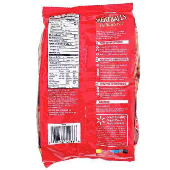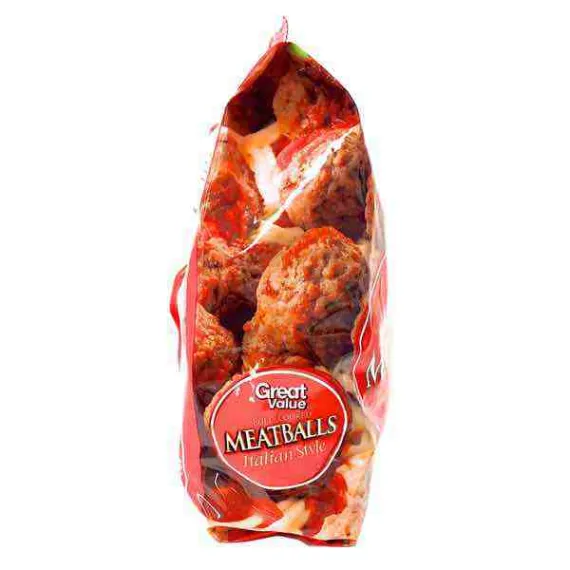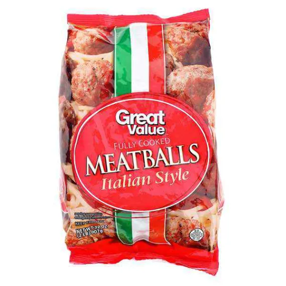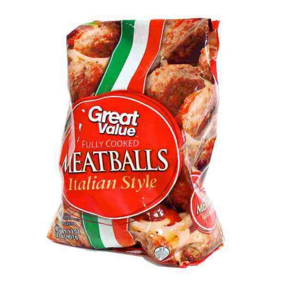 Details Ingredients Beef, Pork, Water, Seasoning (Bread Crumbs [Bleached Wheat Flour, Dextrose, Yeast, Partially Hydrogenated Soybean and/Or Cottonseed Oil, Salt], Dextrose, Corn Syrup Solids, Salt, Parmesan Cheese [Pasteurized Milk, Cheese Cultures, Salt, Enzymes], Spices, Garlic Powder, Parsley Flakes, Dried Onion), Textured Soy Flour, Soy Protein Concentrate. Contains Milk, Wheat and Soy. Show more Product features Great Value Fully Cooked Italian Style Meatballs are an easy and convenient way to spice up your next family meal or social event. These fully cooked meatballs can be served with your typical American Italian style cuisines, such as spaghetti, salad, and garlic bread. You could also place them in a slow cooker to bring to your next potluck dinner, or smother them with cheese and serve on french bread. Ready to eat in as little as 6 minutes, these meatballs are the perfect addition to your next home-cooked meal. Try exceptional quality and taste with Great Value Fully Cooked Italian Style Meatballs. Great Value products provide families with affordable, high quality grocery and household consumable options. With our wide range of product categories spanning grocery and household consumables, we offer you a variety of products for your family's needs. Our products are conveniently available online and in Walmart stores nationwide, allowing you to stock up and save money at the same time Great Value Fully Cooked Italian Style Meatballs, 32 oz Contains beef and pork Goes great with pasta, salad, and garlic bread Fully cooked Ready in as little as 6 minutes Great Quality, Great Price, Guaranteed Special Features No artificial flavors Net Quantity of Content 11 X 85 G
