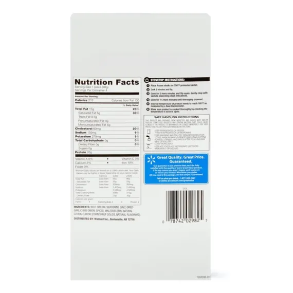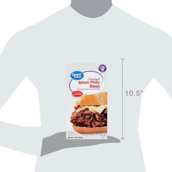 Details Ingredients BEEF SIRLOIN, SEASONING [SALT, DRIED GARLIC AND ONION, SPICES, MALTODEXTRIN, NATURAL CITRUS FLAVOR (CORN SYRUP SOLIDS, NATURAL FLAVORING)]. Show more Product features Great Value Seasoned Sirloin Philly Steak is a great and easy way to cook a meal the entire family will enjoy. This sirloin Philly steak can be served on a wonderfully delicious roll with onions, peppers, mushrooms, cheese, and any other toppings you may desire. The thinly sliced and shaped seasoned sirloin beef will help keep you satisfied and coming back for more. This Great Value steak has been inspected and approved by the United States Department of Agriculture. It contains no trans fat or sugars and is an outstanding source of protein and iron. Bring home the hearty and nutritious taste of Great Value Seasoned Sirloin Philly Steak. Great Value products provide families with affordable, high quality grocery and household consumable options. With our wide range of product categories spanning grocery and household consumables, we offer you a variety of products for your family's needs. Our products are conveniently available online and in Walmart stores nationwide, allowing you to stock up and save money at the same time Great Value Seasoned Sirloin Philly Steak, 14 oz Thinly sliced and shaped seasoned sirloin beef Goes great on a sub No trans fat, sugars or carbohydrates 19 grams of protein per serving U.S. inspected and passed by Department of Agriculture Net Quantity of Content 4 X 98 g