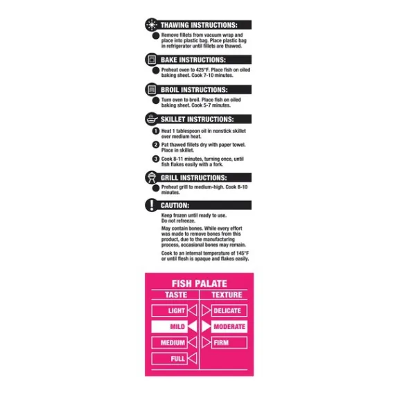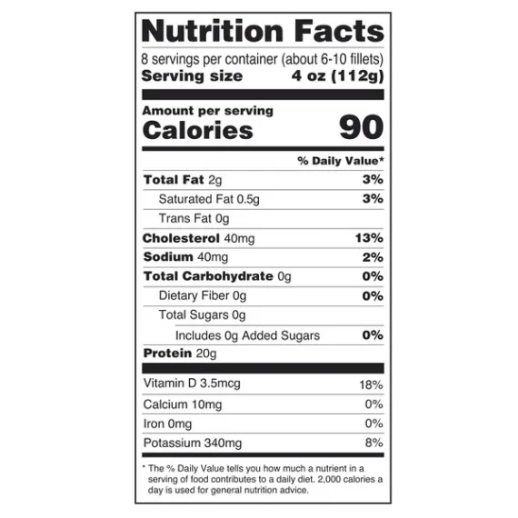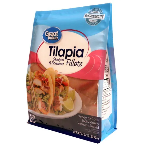 Details Ingredients TILAPIA, CARBON MONOXIDE (TREATED TO RETAIN NATURAL COLOR). Product features Great Value Frozen Tilapia Fillets are a delicious freshwater fish that have a moderate texture and incredibly mild flavor. The versatility of tilapia lends itself to a variety of preparations including sauteed, fried, grilled and baked. It pairs well with a side of roasted red potatoes, baked carrots and wild rice. This fish is great for health-conscious individuals as it does not contain any carbohydrates or trans-fat. These fillets are a low-calorie, lean source of protein. They are individually vacuum sealed, and they are ready to cook. Boneless and skinless, this tilapia is also 100% sustainably sourced. Enjoy fresh-from-the-source taste with these premium Great Value Frozen Tilapia Fillets. Great Value products provide families with affordable, high-quality grocery and household consumable options. With our wide range of product categories spanning grocery and household consumables, we offer you a variety of products for your family's needs. Our products are conveniently available online and in Walmart stores nationwide, allowing you to stock up and save money at the same time. Bake Instructions: Preheat oven to 425°F. Place fish on oiled baking sheet. Cook 7-10 minutes. Skillet Instructions: Heat 1 Tbsp. oil in nonstick skillet over medium heat. Pat thawed fillets dry with paper towel. Place in skillet. Cook 8-11 minutes, turning once, until fish flakes easily with a fork. Great Value Frozen Tilapia Fillets, 2 lb: Sweet, mild flavor with flaky texture About 6-10 boneless and skinless fillets 100% sustainably sourced freshwater fish Only 90 calories per serving 20 grams of protein per serving Ready to cook Serve with roasted potatoes and wild rice Special Features Value pack Net Quantity of Content ABOUT 8 X 4 oz