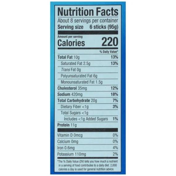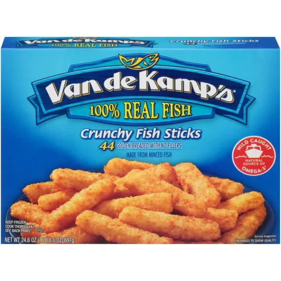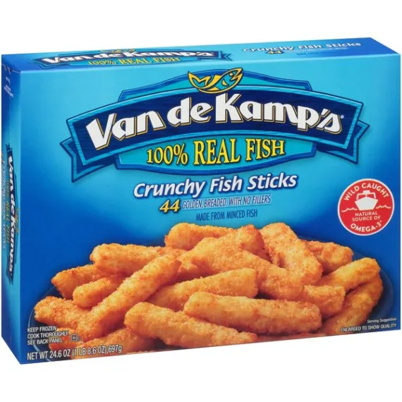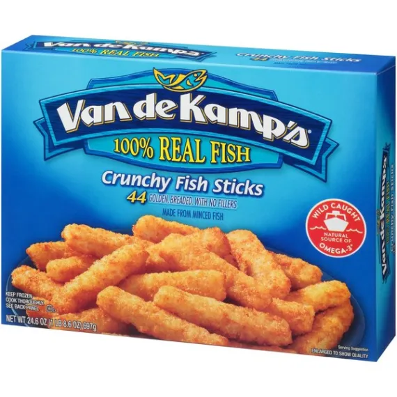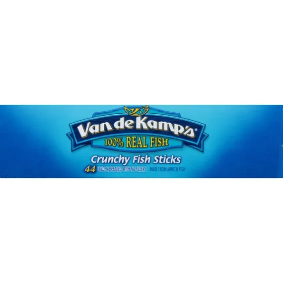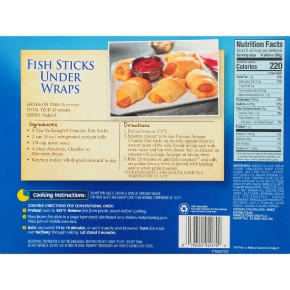 Details Ingredients MINCED POLLOCK, BREAD CRUMBS (UNBLEACHED WHEAT FLOUR, SUGAR, SALT AND YEAST), WATER, COTTONSEED OIL AND/OR SOYBEAN OIL, WHEAT FLOUR. CONTAINS 2% OR LESS OF: ENRICHED WHEAT FLOUR (WHEAT FLOUR [ENRICHED WITH NIACIN, FERROUS SULFATE, THIAMINE MONONITRATE, RIBOFLAVIN, FOLIC ACID], SALT, SOYBEAN OIL), MODIFIED FOOD STARCH, SALT, SUGAR, LEAVENING (SODIUM ACID PYROPHOSPHATE, SODIUM BICARBONATE, MONOCALCIUM PHOSPHATE), DEXTROSE, GARLIC POWDER, ONION POWDER, NATURAL FLAVORS, PAPRIKA. Show more Product features Fish Sticks, Crunchy 44 fillets [24.6 oz (1 lb 8.6 oz) 697 g] 100% whole fillets. 44 golden, breaded, cut from whole fillets. 2009 Best Taste Chefs Best Award by American Culinary ChefsBest. The ChefsBest Award for Best Taste us awarded to the brand rated highest overall among leading brands by independent professional chefs. 100% whole fillets, never minced. Good source of protein. 200 mg of omega 3 fatty acids per serving. 0 grams trans fat per serving. For food safety and quality, follow these cooking instructions. Do not thaw. Conventional Oven: (Van de Kamp's does not recommend microwave preparation.) 1. Preheat oven to 425 degrees F. Remove fish from plastic pouch before cooking. 2. Place Van de Kamp's frozen fish sticks in a single layer evenly distributed on a 4-sided baking pan. 3. Bake on middle oven rack 12 to 15 minutes or until crispy and browned. Turn fish sticks over halfway through baking. Let stand 3 minutes. Keep frozen until ready to use. Do not refreeze. Do not use in toaster oven. Promptly refrigerate any unused fish sticks. Contains: fish (pollock), wheat. Manufactured on equipment that also processes; whiting, cod, sole/flounder, haddock, tilapia, halibut. 44 fillets [24.6 oz (1 lb 8.6 oz) 697 g] Cherry Hill, NJ 08002-4112 Fish Sticks, Crunchy 100% whole fillets. 44 golden, breaded, cut from whole fillets. 2009 Best Taste Chefs Best Award by American Culinary ChefsBest. The ChefsBest Award for Best Taste us awarded to the brand rated highest overall among leading brands by independent professional chefs. 100% whole fillets, never minced. Good source of protein. 200 mg of omega 3 fatty acids per serving. 0 grams trans fat per serving. Special Features Kosher Net Quantity of Content ABOUT 8 X 95 g