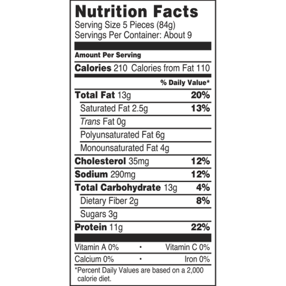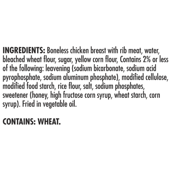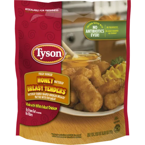 Details Ingredients BONELESS CHICKEN BREAST WITH RIB MEAT, WATER, BLEACHED WHEAT FLOUR, SUGAR, YELLOW CORN FLOUR, CONTAINS 2% OR LESS OF THE FOLLOWING: HONEY POWDER (HONEY, HIGH FRUCTOSE CORN SYRUP, WHEAT STARCH, CORN SYRUP), LEAVENING (SODIUM BICARBONATE, SODIUM ACID PYROPHOSPHATE, SODIUM ALUMINUM PHOSPHATE), MODIFIED CELLULOSE, MODIFIED FOOD STARCH, RICE FLOUR, SALT, SODIUM PHOSPHATES. FRIED IN VEGETABLE OIL. Show more Product features Tyson® Fully Cooked Honey Battered Breast Tenders, 25.5 oz. (Frozen) One 25.5 oz. package of Honey Battered Breast Tenders All-natural, minimally processed chicken raised with no antibiotics ever and no added hormones or steroids 13 grams of protein per serving 0 grams of trans fat per serving Fully cooked and ready-to-eat Resealable bag for easy storage Prepare in an oven or microwave Serve with ketchup for a protein-packed lunch Special Features 0G trans fat Net Quantity of Content ABOUT 9 X 5 Pieces