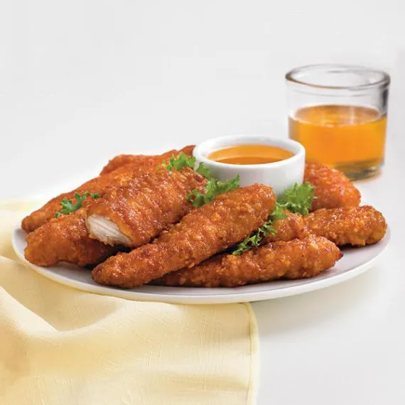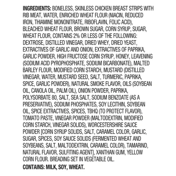 Details Ingredients Boneless, skinless chicken breast with rib meat, chicken broth, bleached wheat flour, vinegar, aged cayenne peppers, wheat flour, salt, contains 2% or less of the following: modified corn starch, spices, maltodextrin, yellow corn flour, sodium phosphates, modified tapioca starch, vinegar powder (maltodextrin, modified food starch, and vinegar), sodium diacetate, dextrose, sugar, dehydrated onion, dehydrated garlic, xanthan gum, yeast, guar gum, spice extractives, caramel color, oleoresin paprika, carob bean gum, natural flavor, leavening (sodium acid pyrophosphate, sodium bicarbonate), onion powder, polysorbate 80, extractives of paprika and granulated garlic. Breading set in vegetable oil. Show more Product features Click here to order Tyson Fully Cooked Honey BBQ Frozen Chicken Strips for free pickup on Walmart Grocery! Delicious, high-quality frozen chicken from a trusted brand Excellent source of protein made with chicken raised with no antibiotics ever Make delicious chicken in minutes Fully cooked chicken with sweet Honey BBQ flavor Delicious Chicken in Minutes - No Sauce Necessary! Chicken strips are a classic that kids love and a favorite for families everywhere. These strips are coated with Honey BBQ sauce to make preparing a complete, tasty protein even easier. The honey and barbecue flavors combine to create a unique, sweet-and-tangy flavor. You know you love it - bring home Tyson Honey BBQ Chicken Strips today for a fast, flavorful bite! Our chicken strips are an excellent source of protein, with 22% of your daily value in just one serving! All are made with high quality frozen all-white meat chicken breasts. We guarantee a fresh taste, with no freezer burn. Our chicken keeps so well, you and your family won't even know it was frozen! Trust Tyson Foods for tasty, low carb chicken that everyone will love. Fully Cooked Chicken Strips- Just Add Heat Tyson Fully Cooked Chicken Strips are a quick and easy snack or main course that taste great right out of the oven or microwave. Our tasty chicken strips come fully cooked- perfect for kids, dorm rooms, or tailgating. Pop our frozen chicken strips in the oven for 18 to 20 minutes, or microwave for 3 to 3.5 minutes. You'll get a great center-of-plate protein from a brand that's delivered only quality for more than 85 years. Premium Quality Chicken from Tyson Foods Since 1935, we've made it our mission to raise real chicken that anyone can enjoy, plain and simple. Our founder, John W. Tyson, pioneered a better way to deliver fresh chicken across the country. We've continued his legacy of innovation to bring your family high-quality frozen chicken that won't spoil or disappoint. We are proud partners with independent farmers across America who help bring our high-quality chicken to your family's table. Honey BBQ Chicken Strips with Unlimited Possibilities Tyson Fully Cooked Honey BBQ Chicken Strips are delicious right out of the oven, or add your favorite side or dip for a surefire party or tailgating hit. Try out this recipe from Tyson.com/recipes. BBQ Chicken Pizza Rolls Ingredients 16 pieces Tyson Fully Cooked Honey BBQ Chicken Strips 1/2 cup barbecue sauce 1/4 cup cilantro chopped 2 lavash flatbread 8 slices sharp cheddar cheese 1/4 cup red onion diced Cooking Instructions Prepare Honey BBQ Chicken Strips according to package directions. When done cooking, maintain oven temperature at 425°F. Make cilantro BBQ dipping sauce by combining barbecue sauce and cilantro in a small bowl. Set aside. Line a baking pan with foil and spray with nonstick cooking spray. Set aside. Lay out flatbread on a clean work surface, place 4 slices of cheese onto each flatbread and 2 tablespoons of diced onion. On the edge of the flatbread line 2-3 chicken tenders and roll tightly. Repeat. Place rolls on prepared baking pan, with seam side down and heat for 7-10 minutes or until golden brown. Serve with cilantro BBQ sauce. Tyson Frozen Chicken is available at Walmart in-store, or online through Online Grocery Pickup . Add some delicious Tyson chicken to your order and whip up a simple, sensational meal tonight! Premium-quality chicken from a trusted brand Breaded and flavored with delicious Honey BBQ sauce Tasty frozen chicken for a simple center-of-plate protein Make delicious chicken in minutes Excellent source of protein made with chicken raised with no antibiotics ever Forget freezer burn— our chicken stays good and tastes great Pair with your favorite sauces and sides, or eat plain on the go Tyson frozen chicken fits into countless recipes Check out Tyson.com/recipes for ideas and inspiration. Special Features Made with white meat Net Quantity of Content 8 X 3 oz (84g)