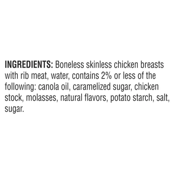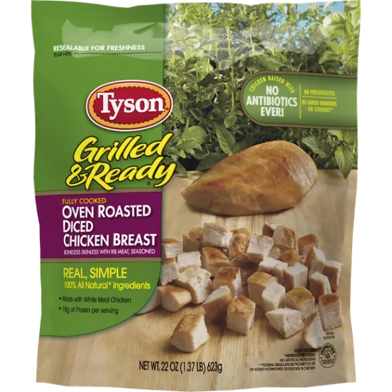 Details Ingredients BONELESS, SKINLESS CHICKEN BREAST WITH RIB MEAT, WATER, CONTAINS 2% OR LESS OF THE FOLLOWING: CANOLA OIL, CHICKEN FLAVOR, CHICKEN STOCK, DEXTROSE, FLAVORS, MALTODEXTRIN, MOLASSES, SALT, SUGAR, YEAST EXTRACT. Show more Product features Made with chicken raised with no antibiotics ever, Tyson® Grilled & Ready® Fully Cooked Oven Roasted Diced Chicken Breast is a delicious addition to any meal. Our diced chicken breast is made with 100% all-natural* chicken, then seasoned and oven roasted to perfection. With 19 grams of protein per serving, our chicken is juicy, flavorful and 97% fat-free. To prepare, heat oven to 375°F and bake for 18 to 20 minutes. Simply toss with fresh vegetables and pasta with a splash of olive oil for a delicious weeknight dinner. Includes 22 oz. of Fully Cooked Oven Roasted Diced Chicken Breast. At Tyson Foods, we believe every family deserves to bring premium chicken to their table and we bring high quality farm raised chicken to you. Everything seems to turn out a whole lot better when you just keep it simple. No nonsense, just stick to the good stuff. The 100% real stuff that makes life, and chicken, great. With high quality farm raised chicken, we keep it real in everything we do. Keep it real. Keep it Tyson. *Minimally processed, no artificial ingredients One 22 oz. package of Fully Cooked Oven Roasted Diced Chicken Breast Made with all-natural, minimally processed chicken raised with no antibiotics ever Excellent source of protein – 19 grams per serving Juicy, flavorful and 97% fat-free Fully cooked and simple to prepare Special Features Carved from real breast fillets with rib meat Net Quantity of Content ABOUT 7 X 3 oz