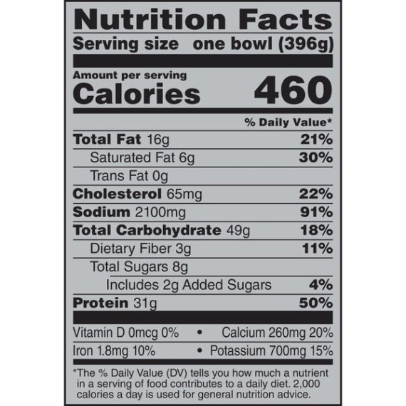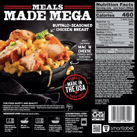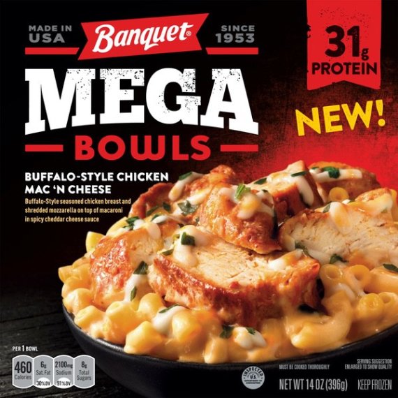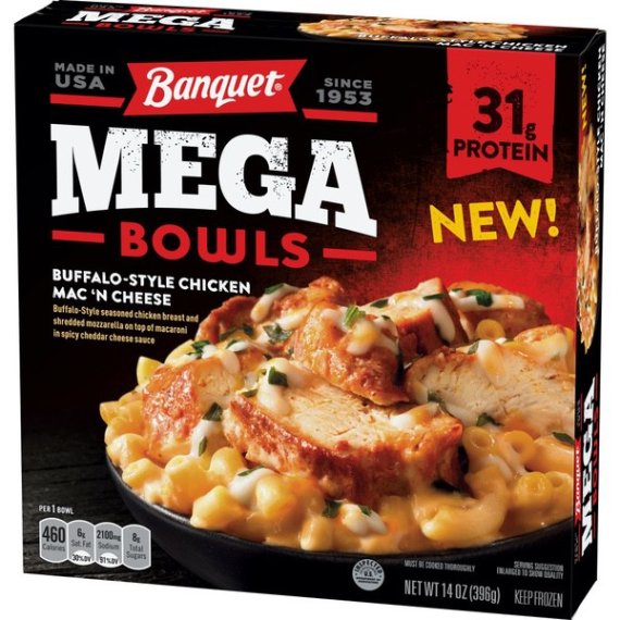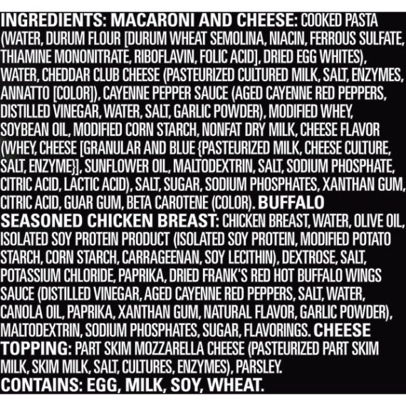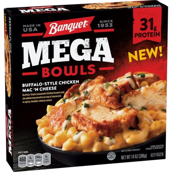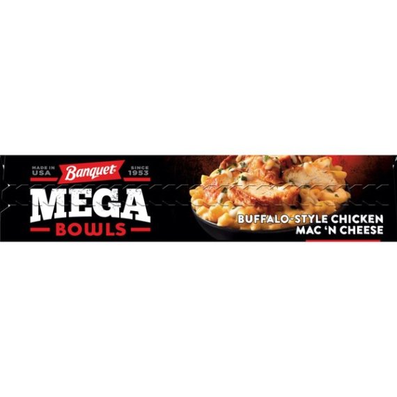 Details Ingredients MACARONI AND CHEESE: Cooked Pasta (Water, Durum Flour [Durum Wheat Semolina, Niacin, Ferrous Sulfate, Thiamine Mononitrate, Riboflavin, Folic Acid], Dried Egg Whites), Water, Cheddar Club Cheese (Pasteurized Cultured Milk, Salt, Enzymes, Annatto [Color]), Cayenne Pepper Sauce (Aged Cayenne Red Peppers, Distilled Vinegar, Water, Salt, Garlic Powder), Modified Whey, Soybean Oil, Modified Corn Starch, Nonfat Dry Milk, Cheese Flavor (Whey, Cheese [Granular and Blue {Pasteurized Milk, Cheese Culture, Salt, Enzyme}], Sunflower Oil, Maltodextrin, Salt, Sodium Phosphate, Citric Acid, Lactic Acid), Salt, Sugar, Sodium Phosphates, Xanthan Gum, Citric Acid, Guar Gum, Beta Carotene (Color). BUFFALO SEASONED CHICKEN BREAST: Chicken Breast, Water, Olive Oil, Isolated Soy Protein Product (Isolated Soy Protein, Modified Potato Starch, Corn Starch, Carrageenan, Soy Lecithin), Dextrose, Salt, Potassium Chloride, Paprika, Dried Frank's Red Hot Buffalo Wings Sauce (Distilled Vinegar, Aged Cayenne Red Peppers, Salt, Water, Canola Oil, Paprika, Xanthan Gum, Natural Flavor, Garlic Powder), Maltodextrin, Sodium Phosphates, Sugar, Flavorings. CHEESE TOPPING: Part Skim Mozzarella Cheese (Pasteurized Part Skim Milk, Skim Milk, Salt, Cultures, Enzymes), Parsley. CONTAINS: EGG, MILK, SOY, WHEAT. Show more Product features Satisfy your appetite with Banquet Mega Bowls Buffalo-Style Chicken Mac 'N Cheese. Banquet's made their mac and cheese even better, topped with a hearty helping of Buffalo-style seasoned chicken breast and shredded mozzarella. Skip dishwashing - just heat up your meal in the microwave and dispose of the dish when you're finished. Give yourself a boost after an intense workout at the gym or a grueling day at work with this Banquet Mega Bowl with 460 calories, 31g protein, and 0g trans fat; contains egg, milk, soy, and wheat. Banquet Mega Meals and Mega Bowls serve up bold flavors for bold appetites in hearty meals. This pack contains one 14 Ounce box of Banquet Mega Bowls Buffalo-Style Chicken Mac 'N Cheese. This pack contains one 14 Ounce box of Banquet Mega Bowls Buffalo-Style Chicken Mac 'N Cheese Packed with protein-rich, hearty portions, Banquet Mega Meals help you refuel so you can keep your head in the game Banquet's made their mac and cheese even better, topped with a hearty helping of Buffalo-style seasoned chicken breast and shredded mozzarella Skip dishwashing - just heat up your meal in the microwave and dispose of the dish when you're finished Give yourself a boost after an intense workout at the gym or a grueling day at work with this Banquet Mega Bowl with 460 calories, 31g protein, and 0g trans fat; contains egg, milk, soy, and wheat Net Quantity of Content 1.0 X 14oz