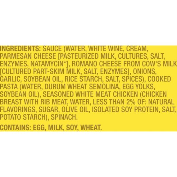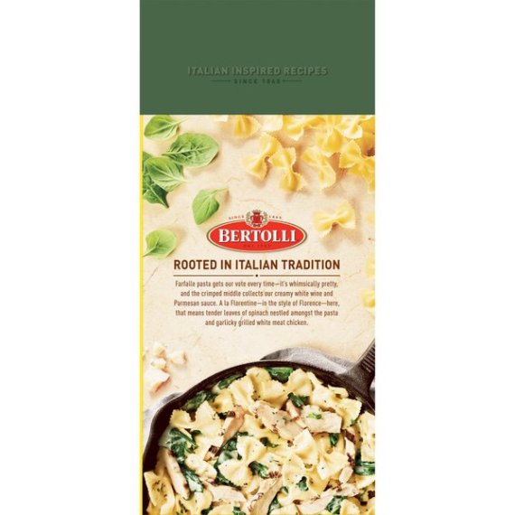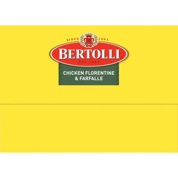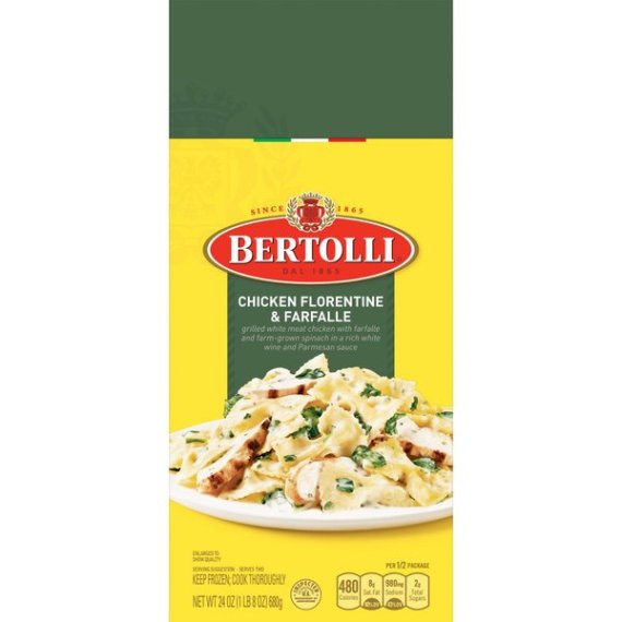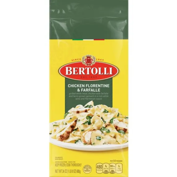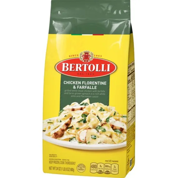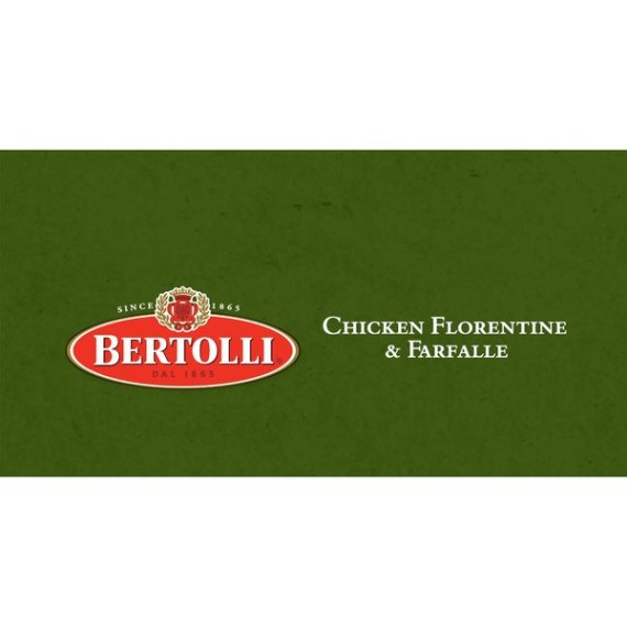 Details Ingredients Sauce (Water, White Wine, Cream, Parmesan Cheese [Pasteurized Milk, Cultures, Salt, Enzymes, Natamycin*], Romano Cheese from Cow's Milk [Cultured Part-Skim Milk, Salt, Enzymes], Onions, Garlic, Soybean Oil, Rice Starch, Salt, Spices), Cooked Pasta (Water, Durum Wheat Semolina, Egg Yolks, Soybean Oil), Seasoned White Meat Chicken (Chicken Breast with Rib Meat, Water, Less Than 2% Of: Natural Flavorings, Sugar, Olive Oil, Isolated Soy Protein, Salt, Potato Starch), Spinach. CONTAINS: EGG, MILK, SOY, WHEAT. Show more Product features Savor a quick and delicious Italian pasta dish made with grilled white meat chicken with farfalle and farm-grown spinach in a rich white wine and Parmesan sauce. This 24 oz package contains one frozen Bertolli Chicken Florentine & Farfalle Skillet Meal for Two; contains soy, egg, wheat, and milk. Deliciously simple Italian inspired cuisine, Bertolli's frozen skillet meals are made with quality ingredients. Conveniently treat yourself to delicious, Italian flavor in the comfort of your own home; simply prepare over the stove in a skillet and your meal is ready in minutes. Bertolli's flavorful frozen skillet meals are thoughtfully prepared in Italian tradition. Frozen meals, fresh taste. Savor a quick and delicious Italian pasta dish made with grilled white meat chicken with farfalle and farm-grown spinach in a rich white wine and Parmesan sauce. This 24 oz package contains one frozen Bertolli Chicken Florentine & Farfalle Skillet Meal for Two; contains soy, egg, wheat, and milk. Deliciously simple Italian inspired cuisine, Bertolli's frozen skillet meals are made with quality ingredients. Conveniently treat yourself to delicious, Italian flavor in the comfort of your own home; simply prepare over the stove in a skillet and your meal is ready in minutes. Bertolli's flavorful frozen skillet meals are thoughtfully prepared in Italian tradition. Frozen meals, fresh taste. Net Quantity of Content 2.0 X 340g