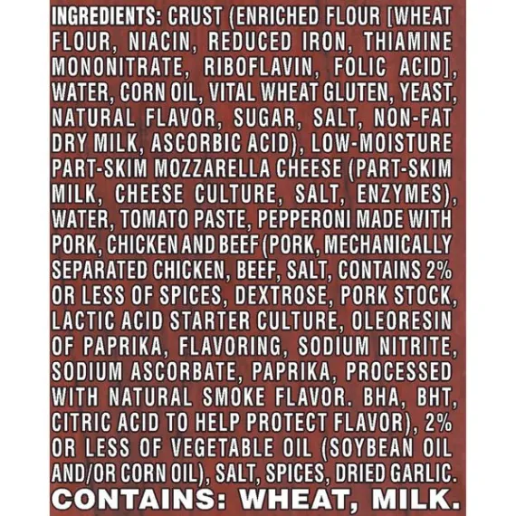 Details Ingredients Crust (Enriched Flour [Wheat Flour, Niacin, Reduced Iron, Thiamine Mononitrate, Riboflavin, Folic Acid], Water, Corn Oil, Vital Wheat Gluten, Yeast, Natural Flavor, Sugar, Salt, Non-Fat Dry Milk, Ascorbic Acid), Low-Moisture Part-Skim Mozzarella Cheese (Part-Skim Milk, Cheese Culture, Salt, Enzymes), Water, Tomato Paste, Pepperoni Made with Pork, Chicken, Beef (Pork, Mechanically Separated Chicken, Beef, Salt, Spices, Dextrose, Pork Stock, Lactic Acid Starter Culture, Oleoresin of Paprika, Flavoring, Sodium Nitrite, Sodium Ascorbate, Paprika, Processed with Natural Smoke Flavor, BHA, BHT, Citric Acid to Help Protect Flavor), Vegetable Oil (Soybean Oil and/or Corn Oil), Salt, Spices, Dried Garlic. Show more Product features DIGIORNO Pepperoni Crispy Pan Pizza comes with an exclusive single-use baking pan and is topped with generous amounts of cheese and flavorful toppings like pepperoni from corner to corner. Our gooey mozzarella melts over the edge to perfectly caramelize the crust as it bakes in the pan. This allows for the hearty 1+ inch of crust to brown and crisp on the edges for an enjoyably crunchy outside and a soft and tender inside. Now you can have an indulgent crispy pan pizza baked fresh from a pan in your oven. Pepperoni made with pork, chicken and beef Includes pan for perfectly crisp crust 100% real cheese No artificial flavors Preservative free crust Net Quantity of Content 5.0 X 1/5 Pizza (147g)