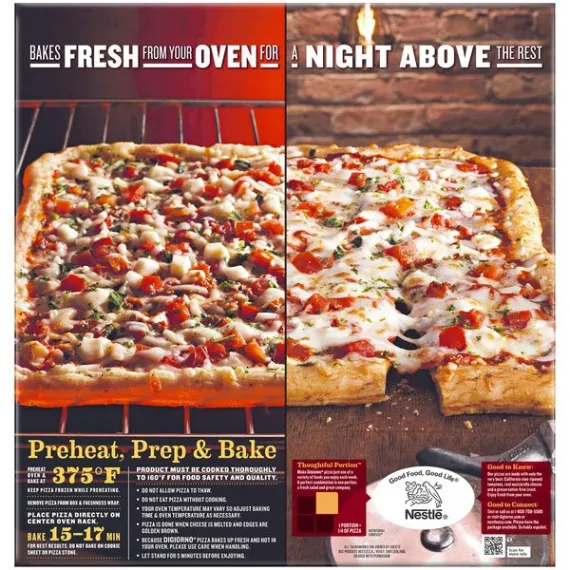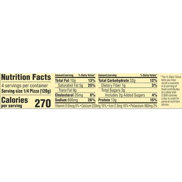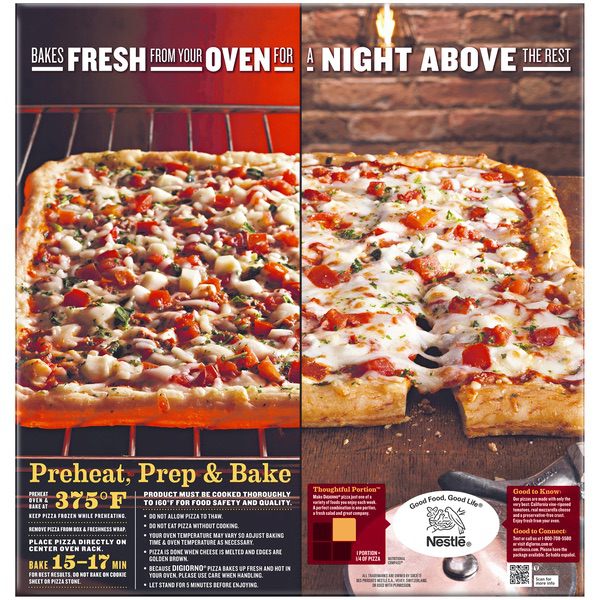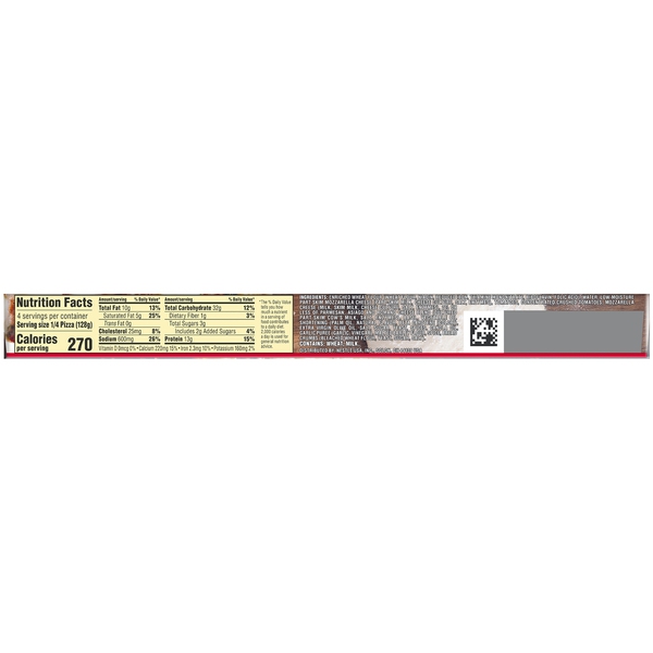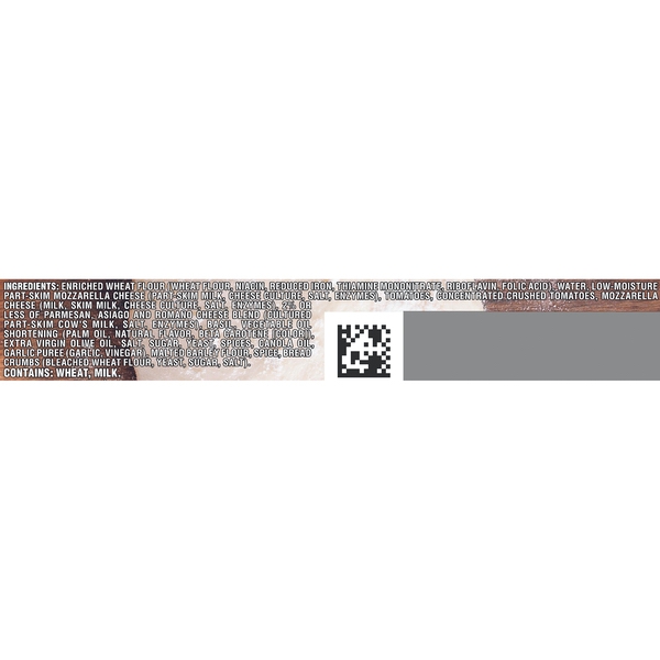Details Ingredients Enriched Wheat Flour (Wheat Flour, Niacin, Reduced Iron, Thiamin Mononitrate, Riboflavin, Folic Acid), Water, Low-Moisture Part-Skim Mozzarella Cheese (Part-Skim Milk, Cheese Culture, Salt, Enzymes), Tomatoes, Tomato Paste, Mozzarella Cheese (Milk, Skim Milk, Cheese Culture, Salt, Enzymes), Parmesan, Asiago, Romano Cheeses Made from Cow's Milk (Part-Skim Milk, Cheese Culture, Salt, Enzymes), Basil, Shortening (Palm Oil, Natural Flavor, Beta Carotene), Extra Virgin Olive Oil, Salt, Sugar, Spices, Yeast, Malted Barley Flour, Canola Oil, Garlic Puree (Garlic, Vinegar), Bread Crumbs (Bleached Wheat Flour, Yeast, Sugar, Salt). Show more Product features The same delicious crust as Pizzeria!, but in a thin profile. We start with a preservative-free crust drizzled with extra virgin olive oil and top it with flavorful sauce made from vine-ripened tomatoes and the finest cheeses and vegetables. And no artificial flavors anywhere! Thin crust that's crispy on the outside, soft & airy inside, and drizzled with extra virgin olive oil Our frozen pizza is topped with a flavorful sauce made with vine-ripened tomatoes & herbs Preservative free crust & no artificial flavors Net Quantity of Content 4.0 X ¼ Pizza (128g)