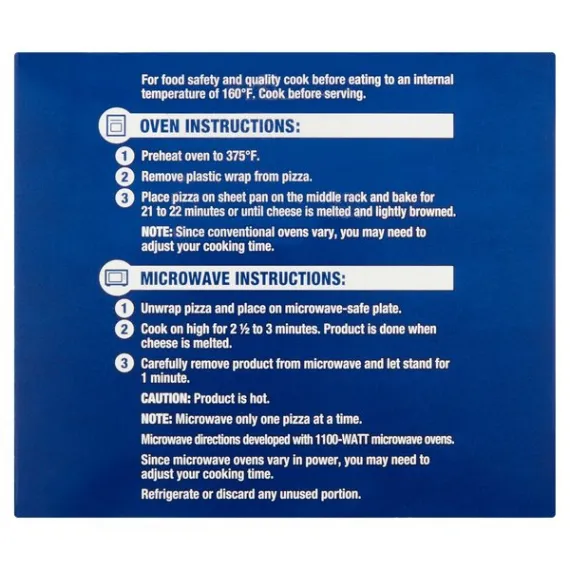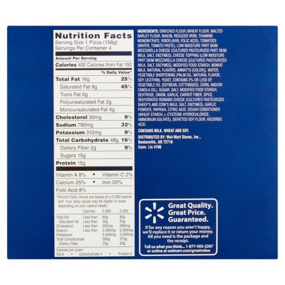 Details Ingredients ENRICHED FLOUR (WHEAT FLOUR, MALTED BARLEY FLOUR, NIACIN, REDUCED IRON, THIAMINE MONONITRATE, RIBOFLAVIN, FOLIC ACID), TOMATOES (WATER, TOMATO PASTE), LOW MOISTURE PART SKIM MOZZARELLA CHEESE (CULTURED PASTEURIZED PART SKIM MILK, SALT, ENZYMES), CHEESE TOPPING (LOW MOISTURE PART SKIM MOZZARELLA CHEESE [ CULTURED PASTEURIZED MILK, SALT, ENZYMES], MODIFIED FOOD STARCH, NONFAT MILK, NATURAL FLAVORS, ANNATTO [ COLOR], WATER, VEGETABLE SHORTENING (PALM OIL, NATURAL FLAVOR, SOY LECITHIN), YEAST. CONTAINS 2% OR LESS OF: VEGETABLE OIL (SOYBEAN, COTTONSEED. CORN, AND/OR CANOLA OIL), SUGAR, SALT, MODIFIED FOOD STARCH, DEXTROSE. ONION, GARLIC CARROT FIBER, SPICE, DEHYDRATED ROMANO CHEESE (CULTURED PASTEURIZED SHEEP'S AND COW S MILK, SALT, ENZYMES), GARLIC POWDER, PAPRIKA. CITRIC ACID, DOUGH CONDITIONER (WHEAT STARCH, L-CYSTEINE HYDROCHLORIDE AMMONIUM SULFATE), DEFATTED SOY FLOUR. ASCORBIC ACID. Show more Product features Great Value Mini Deep Dish Cheese Pizza starts with a crispy deep-dish crust topped with a rich tomato sauce and is generously sprinkled with delectable mozzarella cheese. These cheese lovers' pizzas are perfect for enjoying a quick and easy meal in your home or at the office. Serve with your favorite style of chicken wings, a side salad and a cup of ranch dressing for dipping and voila, a full-course meal is at the ready. Enjoy the pizzas as they are or personalize with all sorts of extra toppings. They offer nutritional benefits as they are an excellent source of dietary fiber, protein, calcium, iron, folic acid and vitamin A, and the REAL label on the box indicates that these pizzas are made with real cow’s milk from actual dairy farms. Each pizza comes individually wrapped, making them a convenient option to have on hand for snacking at any time of the day. In just minutes of it heating in the oven, you’ll be able to enjoy the delicious taste of the Great Value Mini Deep Dish Cheese Pizza. Great Value products provide families with affordable, high quality grocery and household consumable options. With our wide range of product categories spanning grocery and household consumables, we offer you a variety of products for your family's needs. Our products are conveniently available online and in Walmart stores nationwide, allowing you to stock up and save money at the same time. Great Value Deep Dish Mini Pizza, Cheese, 22.4 oz, 4 Count: Pack of 4 miniature deep-dish pizzas Each pizza is individually wrapped inside the box Topped with mozzarella cheese Microwavable Easy meal to enjoy at home or in the office Net Quantity of Content 4 X 158 g