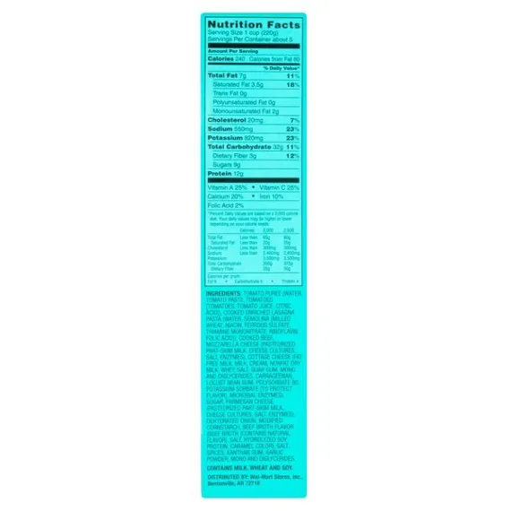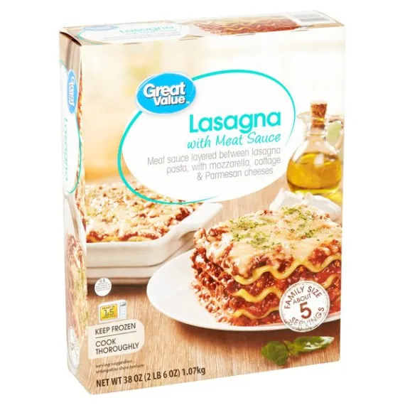 Details Ingredients Tomato Puree (Water, Tomato Paste, Tomatoes [Tomatoes, Tomato Juice, Citric Acid]), Cooked Enriched Lasagna Pasta (Water, Semolina [Milled Wheat, Niacin, Ferrous Sulfate, Thiamine Mononitrate, Riboflavin, Folic Acid]), Cooked Beef, Mozzarella Cheese (Pasteurized Part-Skim Milk, Cheese Cultures, Salt, Enzymes), Cottage Cheese (Fat Free Milk, Milk, Cream, Nonfat Dry Milk, Whey, Salt, Guar Gum, Mono and Diglycerides, Carrageenan, Locust Bean Gum, Polysorbate 80, Potassium Sorbate [To protect flavor], Microbial Enzymes), Sugar, Parmesan Cheese (Pasteurized Part-Skim Milk, Cheese Cultures, Salt, Enzymes), Dehydrated Onion, Modified Cornstarch, Beef Broth Flavor (Beef Broth [Contains Natural Flavor], Salt, Hydrolyzed Soy Protein, Caramel Color), Salt, Spices, Xanthan Gum, Garlic Powder, Mono and Diglycerides Show more Product features Prepare a meal the entire family can enjoy with this Great Lasagna with Meat Sauce. It's made with meat sauce layered between lasagna pasta with mozzarella, cottage and Parmesan cheeses. This Italian-inspired lasagna includes approximately 5 servings and can be baked in the oven or warmed up in the microwave. Each 38 oz package provides you with a convenient meal option for friends, family and party guests. You can feed your family a delicious meal that is easy to prepare. Add a salad and garlic bread for a hearty meal everyone will love. Celebrate dinner time with your family and friends with the Great Value Lasagna with Meat Sauce. Great Value products provide families with affordable, high-quality grocery and household consumable options. With our wide range of product categories spanning grocery and household consumables, we offer you a variety of products for your family's needs. Our products are conveniently available online and in Walmart stores nationwide, allowing you to stock up and save money at the same time. Great Value Frozen Lasagna with Meat Sauce Family Size, 38 oz: Ready to cook Microwaveable Contains about 5 servings Made with meat sauce layered between lasagna pasta with mozzarella, cottage and Parmesan cheeses Special Features Made with mozzarella, cottage, and parmesan cheeses Net Quantity of Content About 5 X 1 cup (220 g)