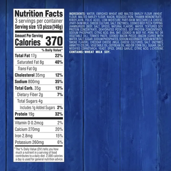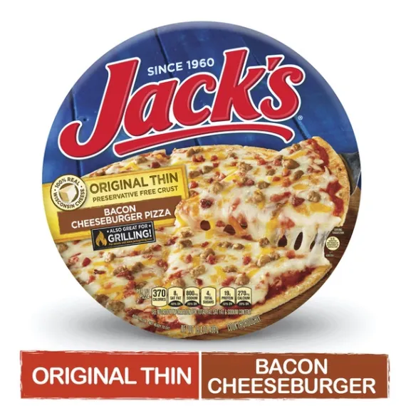 Details Ingredients Water, Enriched Wheat and Malted Barley Flour (Wheat Flour, Malted Barley Flour, Niacin, Reduced Iron, Thiamin Mononitrate, Riboflavin, Folic Acid), Low-Moisture Part-Skim Mozzarella Cheese (Part-Skim Milk, Cheese Culture, Salt, Enzymes), Cooked Beef Pizza Topping (Hamburger [Beef, Salt, Spices, Natural Flavor], Water, Textured Soy Protein Concentrate, Dehydrated Potatoes, Soy Protein Concentrate, Sodium Phosphate, Citric Acid, BHA, BHT. Cooked in Beef Fat, Pork Fat, or Vegetable Oil), Tomato Paste, Cooked Bacon Pieces (Bacon [Cured with Water, Salt, Sugar, Sodium Phosphates, Sodium Ascorbate, Sodium Nitrite], Smoke Flavor), Cheddar Cheese (Milk, Cheese Cultures, Salt, Enzymes, Annatto Color), Vegetable Oil (Soybean Oil and/or Corn Oil), Sugar, Salt, Modified Cornstarch, Yeast, Spice, Dried Garlic, Citric Acid, L-Cysteine. Show more Product features Pizza gimmicks will come and go. This topping, however, will never fade away. Our Bacon Cheeseburger pizza steals the spotlight with this delicious pie. JACK'S savory marinara, 100% real Wisconsin cheese and our famous crispy thin preservative-free crust make this pizza a real treat. Stock up and have a few ready to feed the whole family on a moment's notice without breaking the bank. JACK'S Original Thin Crust Bacon Cheeseburger Pizza, with a crispy crust, heaps of ground beef and crispy bacon mixed with our scrumptious sauce Made with 100% real Wisconsin cheese and a preservative-free crust Keep a few in the freezer so you can cook up a satisfying meal whenever you want. Great for feeding the whole family Simply preheat your oven, unwrap pizza, and cook. JACK'S Original Thin Crust Pizza is also great for gas grilling Net Quantity of Content 3.0 X 1/3 Pizza (146g)