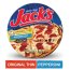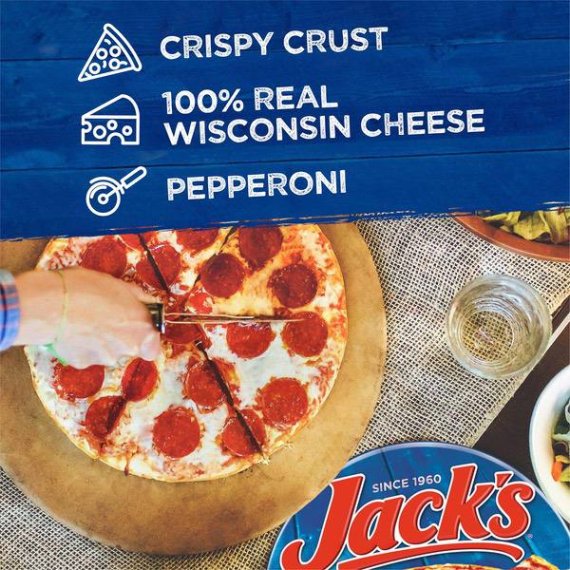 Details Ingredients Water, Enriched Wheat and Malted Barley Flour (Wheat Flour, Malted Barley Flour, Niacin, Reduced Iron, Thiamin Mononitrate, Riboflavin, Folic Acid), Low-Moisture Part-Skim Mozzarella Cheese (Part-Skim Milk, Cheese Culture, Salt, Enzymes), Pepperoni Made with Pork, Chicken and Beef (Pork, Mechanically Separated Chicken, Beef, Salt, Contains 2% or Less of Spices, Dextrose, Pork Stock, Lactic Acid Starter Culture, Oleoresin of Paprika, Flavoring, Sodium Nitrite, Sodium Ascorbate, Paprika, Processed with Natural Smoke Flavor, BHA, BHT, Citric Acid to Help Protect Flavor), Tomato Paste, 2% or Less of Vegetable Oil (Soybean Oil and/or Corn Oil), Sugar, Salt, Modified Food Starch, Cellulose Powder, Yeast, Spices, Dried Garlic, Citric Acid, L-Cysteine Hydrochloride. Show more Product features Pizza gimmicks will come and go. This topping, however, will never fade away. Scrumptious pepperoni makes a starring performance on this delicious pie. JACK'S savory marinara, 100% real Wisconsin cheese and our famous crispy thin preservative-free crust make this pizza a real treat. Stock up and have a few ready to feed the whole family on a moment's notice without breaking the bank. JACK'S Original Thin Crust Pepperoni Pizza, with a crispy crust and scrumptious pepperoni Made with 100% real Wisconsin cheese and a preservative-free crust Keep a few in the freezer so you can cook up a satisfying meal whenever you want. Great for feeding the whole family Simply preheat your oven, unwrap pizza, and cook. JACK'S Original Thin Crust Pizza is also great for gas grilling Net Quantity of Content 3.0 X 1/3 Pizza (136g)