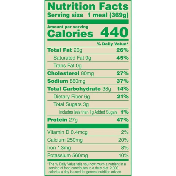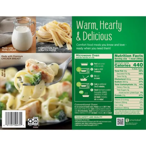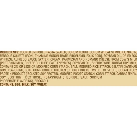 Details Ingredients Cooked Enriched Pasta (Water, Durum Flour [Durum Wheat Semolina, Niacin, Ferrous Sulfate {Iron}, Thiamine Mononitrate, Riboflavin, Folic Acid], Soybean Oil, Dried Egg Whites), Alfredo Sauce (Water, Cream, Parmesan and Romano Cheese from Cow's Milk [Part-Skim Milk, Cheese Culture, Salt, Enzymes], Garlic Sherry Wine, Soybean Oil, Nonfat Dry Milk, Contains 2% or less of: Modified Corn Starch, Salt, Modified Rice Starch, Xanthan Gum, Flavoring, Guar Gum), Cooked Chicken (Chicken Breast, Water, Olive Oil, Isolated Soy Protein Product [Isolated Soy Protein, Modified Potato Starch, Corn Starch, Carrageenan, Soy Lecithin], Dextrose, Potassium Chloride, Salt, Sodium Phosphate, Flavoring), Broccoli. CONTAINS: EGG, MILK, SOY, WHEAT. Show more Product features Comforting, delectable meals are quick and easy with Marie Callender's. Enjoy the flavor of a home-cooked meal in minutes from the microwave or oven with a Marie Callender's entree. Sit down to this comforting meal of fettuccini tossed with white-meat chicken and crisp broccoli in a cheesy Alfredo sauce made with real cream. Savor the taste of home straight from your microwave. Perfect for lunch or dinner, settle down to a comforting meal anytime, at work or at home. This box contains one 13-ounce (369g) meal with 480 calories, 0g trans fat, and 32g protein; contains egg, milk, soy, and wheat. Enjoy the combination of quality ingredients and the love and care baked into Marie Callender's recipes for the comforting taste of delicious, homemade goodness. Enjoy the flavor of a home-cooked meal in minutes from the microwave or oven with a Marie Callender's entree. Sit down to this comforting meal of fettuccini tossed with white-meat chicken and crisp broccoli in a cheesy Alfredo sauce made with real cream. Savor the taste of home straight from your microwave. Perfect for lunch or dinner, settle down to a comforting meal anytime, at work or at home. This box contains one 13-ounce (369g) meal with 480 calories, 0g trans fat, and 32g protein; contains egg, milk, soy, and wheat. Enjoy the combination of quality ingredients and the love and care baked into Marie Callender's recipes for the comforting taste of delicious, homemade goodness. Special Features Prepared with love And care Net Quantity of Content 1.0 X 369g