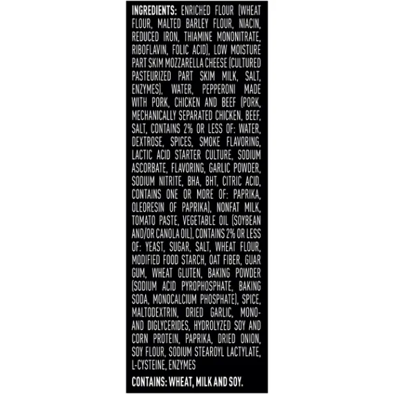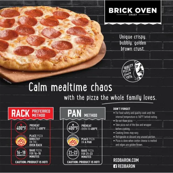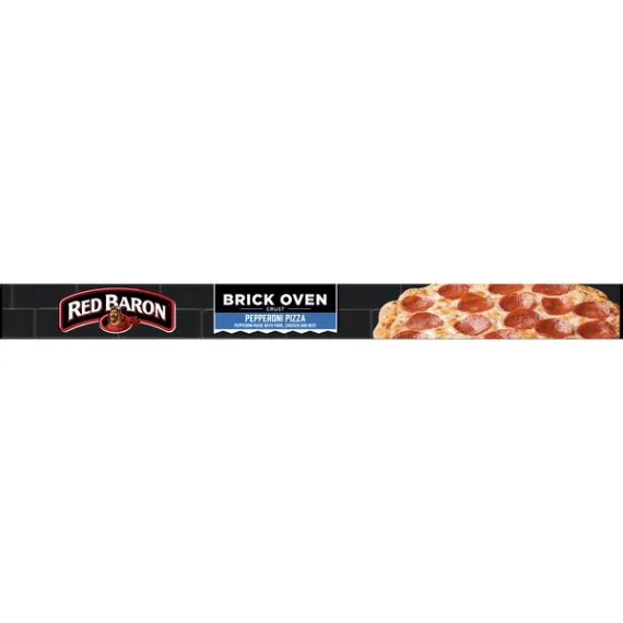 Details Ingredients Enriched Flour (Wheat Flour, Malted Barley Flour, Niacin, Reduced Iron, Thiamine Mononitrate, Riboflavin, Folic Acid), Low Moisture Part Skim Mozzarella Cheese (Cultured Pasteurized Part Skim Milk, Salt, Enzymes), Water, Pepperoni Made with, Pork, Chicken and, Beef (Pork, Mechanically Separated Chicken, Beef, Salt, Contains 2% or Less of: Water, Dextrose, Spices, Smoke Flavoring, Lactic Acid Starter Culture, Sodium Ascorbate, Flavoring, Garlic Powder, Sodium Nitrite, BHA, BHT, Citric Acid, Contains One or More of: Paprika, Oleoresin of Paprika), Nonfat Milk, Tomato Paste, Vegetable Oil (Soybean and/or Canola Oil), Contains 2% or Less of: Yeast, Sugar, Salt, Wheat Flour, Modified Food Starch, Oat Fiber, Guar Gum, Wheat Gluten, Baking Powder (Sodium Acid Pyrophosphate, Baking Soda, Monocalcium Phosphate), Spice, Maltodextrin, Dried Garlic, Mono- and Diglycerides, Hydrolyzed Soy and Corn Protein, Paprika, Dried Onion, Soy Flour, Sodium Stearoyl Lactylate, L-Cysteine, Enzymes. Show more Product features RED BARON® Brick Oven Pepperoni Pizza combines thick pepperoni and crispy, bubbly crust for the perfect blend of texture and flavor. Unique crispy, bubbly and golden brown crust is the perfect base for savory pepperoni, real mozzarella cheese, and robust sauce, which will make you fall in love at first bite with RED BARON® Brick Oven Pepperoni Pizza. Authentic RED BARON® Brick Oven Pizza has unique crispy, bubbly golden brown crust topped with premium cheeses, robust sauce and hearty toppings. Pizza, Brick Oven Crust, Pepperoni Pepperoni made with pork, chicken and beef. Premium quality. Made with real 100% cheese. US inspected and passed by Department of Agriculture. It all starts with the perfect crust. A unique crispy, bubbly texture with a golden brown crust. Recyclable. Recycling programs for this package may not exist in your area. For information or questions call 1-800-769-7980. Redbaron.com. Facebook.com/Redbaronpizza. Made in the USA. Net Quantity of Content 4.0 X ¼ Pizza (127g)