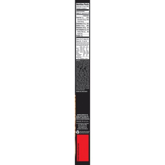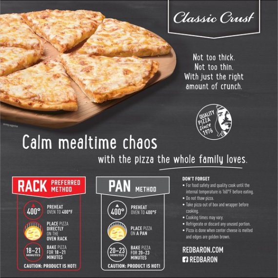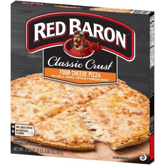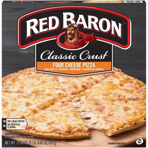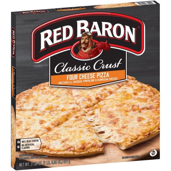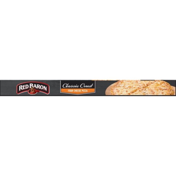 Details Ingredients Cheeses (Low Moisture Part Skim Mozzarella and Parmesan Cheeses [Cultured Pasteurized Part Skim Milk, Salt, Enzymes], Cheddar Cheese [Cultured Pasteurized Milk, Salt, Enzymes, Annatto (Color)], Provolone Cheese [Cultured Pasteurized Milk, Salt, Enzymes]), Tomatoes (Water, Tomato Paste), Enriched Flour (Wheat Flour, Malted Barley Flour, Niacin, Reduced Iron, Thiamine Mononitrate, Riboflavin, Folic Acid), Water, Contains 2% or Less of: Yeast, Palm Oil, Vegetable Oil (Soybean and/or Canola Oil), Sugar, Salt, Modified Food Starch, Spice, Sea Salt, Maltodextrin, Dried Garlic, Hydrolyzed Soy and Corn Protein, Paprika, Dried Onion, Wheat Starch, L-Cysteine Hydrochloride, Ammonium Sulfate, Natural Flavor, Soy Lecithin, Enzymes (Contains Wheat), Ascorbic Acid (Dough Conditioner). Show more Product features Four savory cheeses and a crust with just the right crunch make RED BARON® Classic Crust 4 Cheese Pizza perfect anytime. If you really love cheese, show it some respect. Our four-cheese pizza is a unique blend of real, premium cheeses atop our perfect, classic golden-brown crust that’s not too thick and not too thin. Because great cheese demands nothing less than the perfect satisfying crunch of our classic crust. There's a reason this crust is a classic – not too thick and not too thin, with just the right amount of crunch. Pizza, Classic Crust, 4 Cheese Mozzarella, cheddar, provolone & parmesan cheeses. Crispy, airy flaky layers. Premium quality. Made with Real 100% cheese. Mozzarella, cheddar, provolone & parmesan cheeses. Crispy, airy flaky layers. Premium quality. Made with Real 100% cheese. It all starts with the perfect crust. Not too thick, not too thin, with just the right amount of crunch. Redbaron.com. Facebook.com/redbaronpizza. Recyclable. Recycling programs for this package may not exist in your area. For information or questions call 1-800-769-7980. Made in USA. Special Features Mozzarella, cheddar, provolone And parmesan cheeses Net Quantity of Content 4.0 X 1/4 pizza (149g)